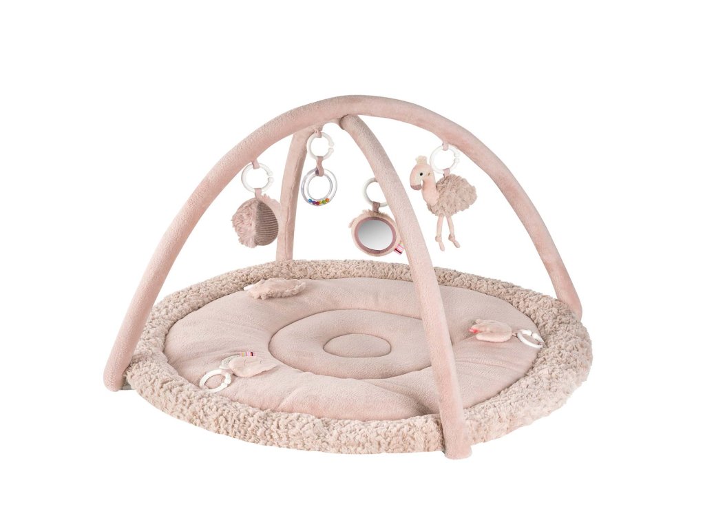 Interaktívna deka s plameniakom a priestorom na ležanie z rôznych hebkých materiálov pozýva bábätko k mojkaniu, objavovaniu a hre. Tri odnímateľné prvky so šuštivým papierom, pískatkom a hrkálkou na deke podporujú hmatové vnímanie a koordináciu ruka–oko.