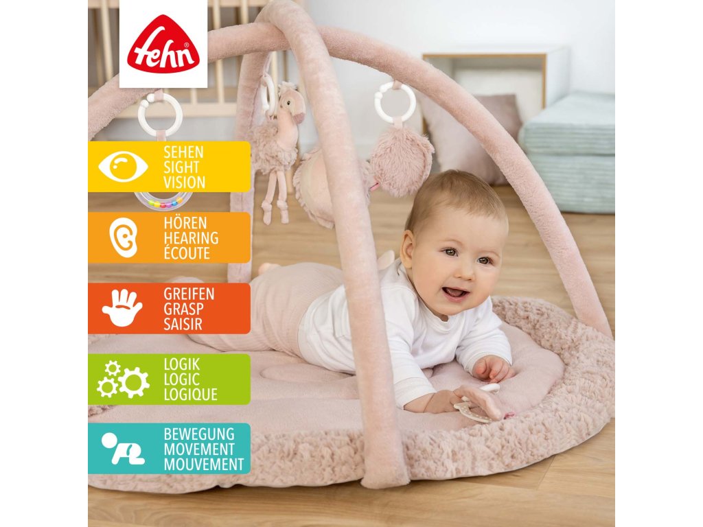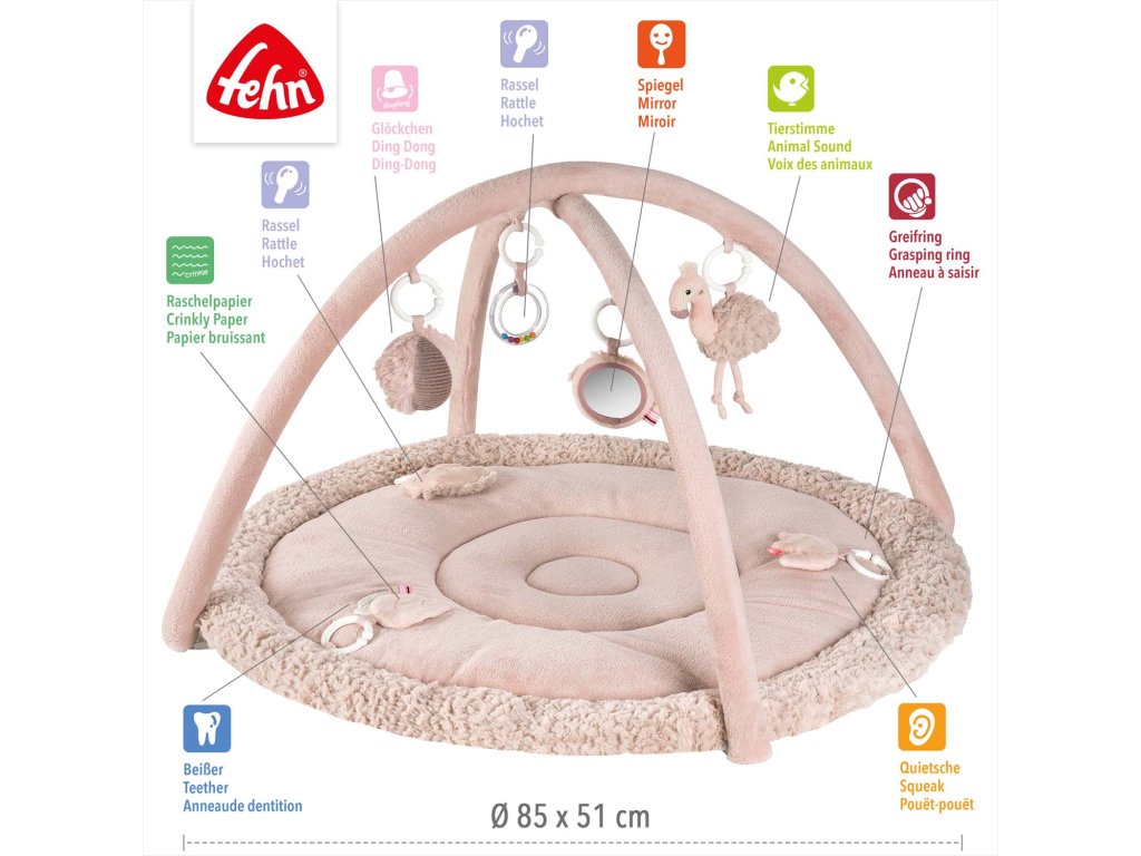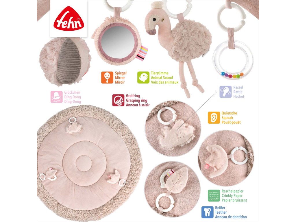 Na dvoch hrazdičkách visia ďalšie hračky: hrkálka s krúžkami, skrytá rolnička v loptičke, zrkadielko a plameniak s realistickým zvieracím zvukom. Tieto prvky upútajú detskú pozornosť, predĺžia čas sústredenia a prinesú radosť z hry.