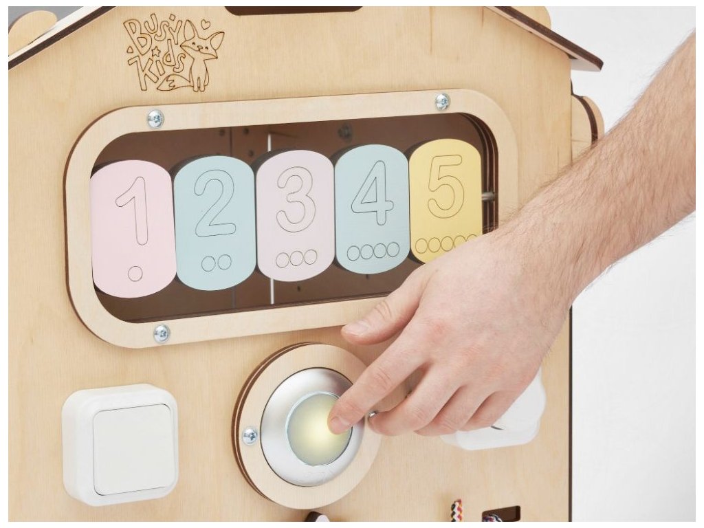 Táto doska obsahuje otočné doštičky s číslami, zásuvku, vypínač, dotykové svetlo, otočný kvietok, prevliekaciu reťaz, lano na tréning uzlov, počítadlo a huňatý valček. Toľko užitočných príkladov do života na jednom mieste! Táto časť domčeka priamo nabáda k spolupráci rodičov a detí, uvidíte, že budete čeliť množstvu zvedavých otázok.