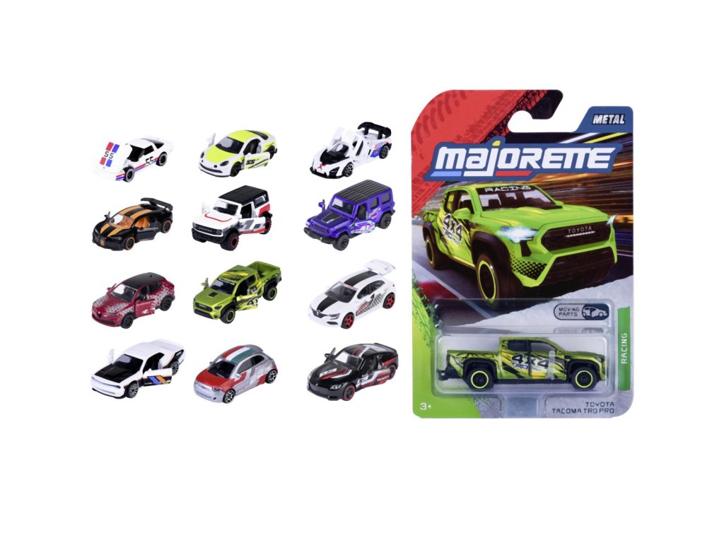 Kovové autíčko z radu Racing. Voľnobeh, otváracie časti. Mierka 1:64, dĺžka cca 7,5 cm. 12 druhov.