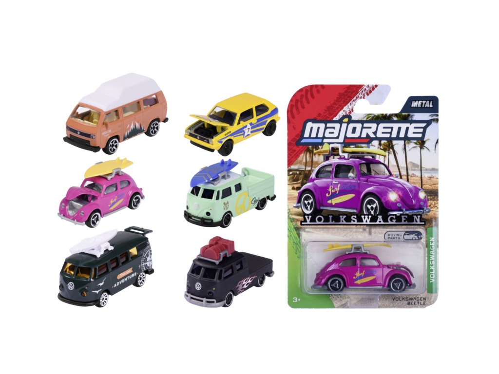 Premiový kovový model autíčka Volkswagen, na voľnobeh, s dielmi, ktoré je možné otvoriť a/alebo presunúť, a s odpružením. 6 druhov. V mierke 1:64, dĺžka 7,5 cm.