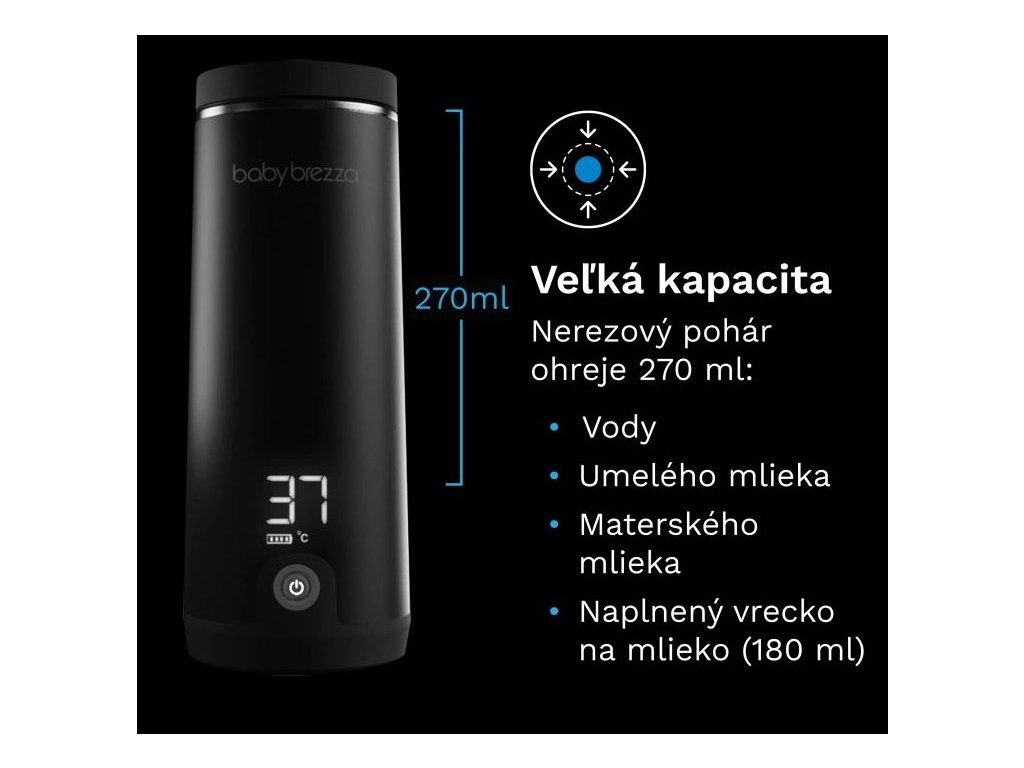 Ohrievač Baby Brezza SuperFast Portable Warmer je navrhnutý s ohľadom na náročné situácie rodičov pri krmení mimo domova. Vďaka výkonnému 100 W ohrievaciemu prvku ohrieva až 240 ml tekutiny – napríklad formuly, materského mlieka alebo vrecúška s mliekom – z izbovej teploty na približne 37 °C za 3 minúty, čo je o 67 % rýchlejšie ako bežné prenosné ohrievače.