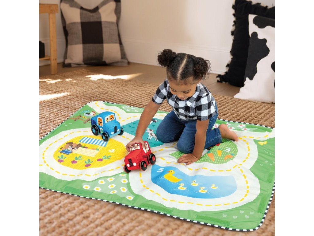 Objavte hraciu deku, ktorá rastie spolu s vaším dieťaťom od narodenia až po predškolský vek! Deka na hranie ponúka až 4 herné režimy, ktoré podporujú vývoj dieťaťa od 0 mesiacov do 4+ rokov. Táto extra veľká a mäkká podložka je ideálna na čas na brušku, hranie na chrbátiku, sedenie aj aktívnu hru pre batoľatá. Obsahuje 3 odnímateľné závesné hračky – zrkadielko v tvare slnečnice, šuštiacu mrkvičku a plyšového húsenicového kamarátka Cala. Dve hudobné autíčka (traktor a pickup) so zvukmi fariem, zvierat a 30+ melódiami pomáhajú podporiť pohyb a rozvoj motoriky. Pre sediace deti ponúka 3D interaktívnu farmu so senzorickým triedičom tvarov a zdvíhacími klapkami, ktoré ukrývajú prekvapenia. Pre väčšie deti sa podložka rozloží do hernej cesty, po ktorej môžu voziť hračkárske autíčka ako na výlete po farme! Tento hrací set je skvelým darčekom pre každé bábätko – podporuje zmyslový vývoj, motorické zručnosti a učenie formou hry už od prvých dní.