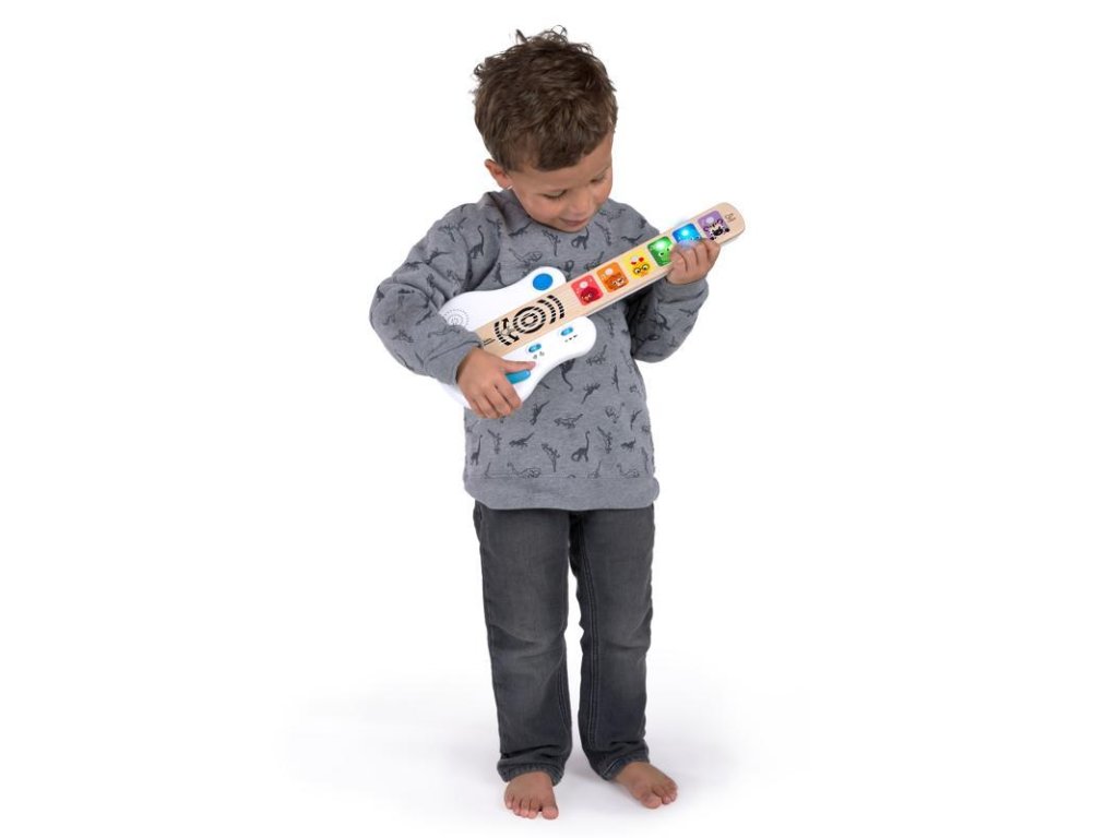Táto drevená hračka je vybavená ocenenou technológiou Magic Touch, vďaka ktorej máte hudbu na dosah ruky ... bez potreby tlačidiel alebo strún! Realistické zvuky gitary reagujú na brnkavé pohyby vášho dieťaťa. Vaša budúca rocková hviezda môže vytvárať vlastné kombinácie akordov alebo hrať s vopred nahratými melódiami. Pomocou tremola sa prepnete do režimu, kde získate ďalšie zvukové efekty. Táto hračka podporuje rozvoj senzorických a motorických schopností. Podporte tvorivosť a lásku k hudbe s prvou gitarou dieťaťa!