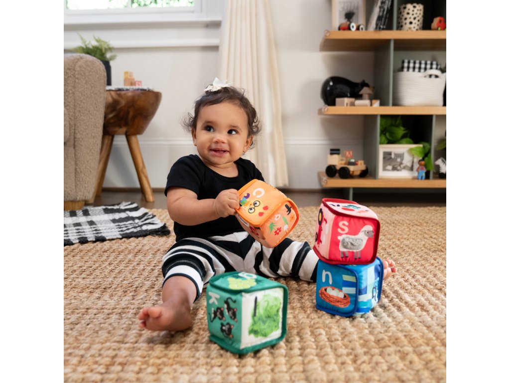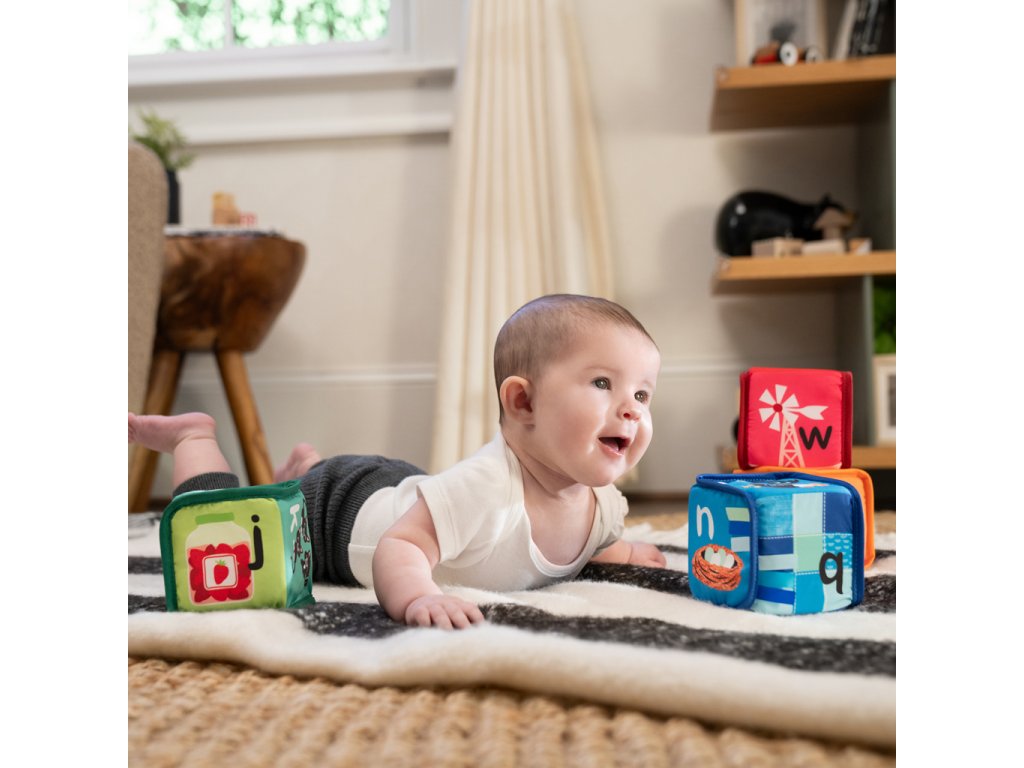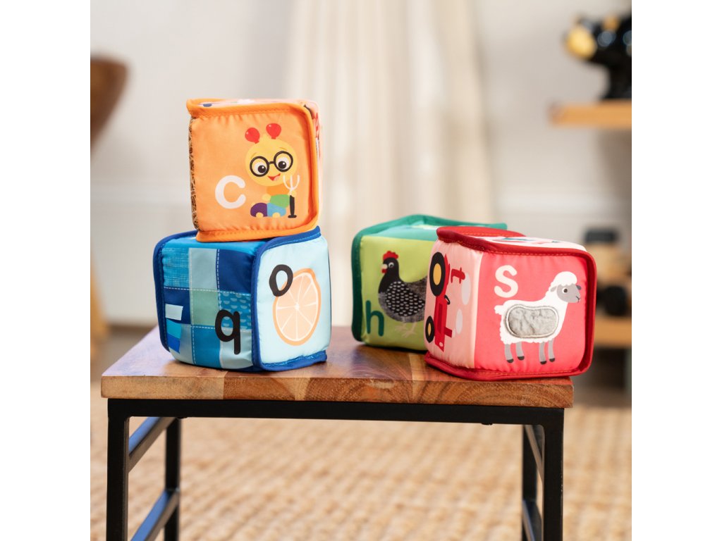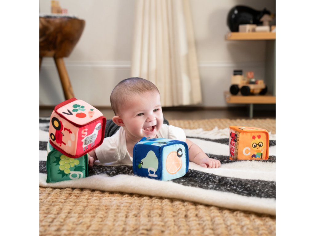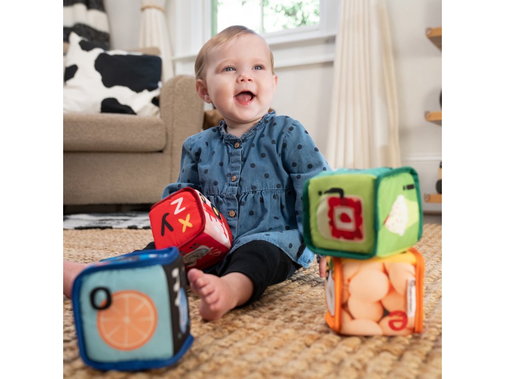 Objavovanie abecedy a zmyslového vnímania ešte nikdy nebolo také zábavné! Mäkké kocky sú navrhnuté pre malé rúčky, ktoré chcú stavať, hádzať, stláčať - jednoducho objavovať. Každá zo 4 kociek je plná farieb, zvukov a rôznych textúr, ktoré podporujú rozvoj jemnej motoriky a princípu „príčina a následok“ .