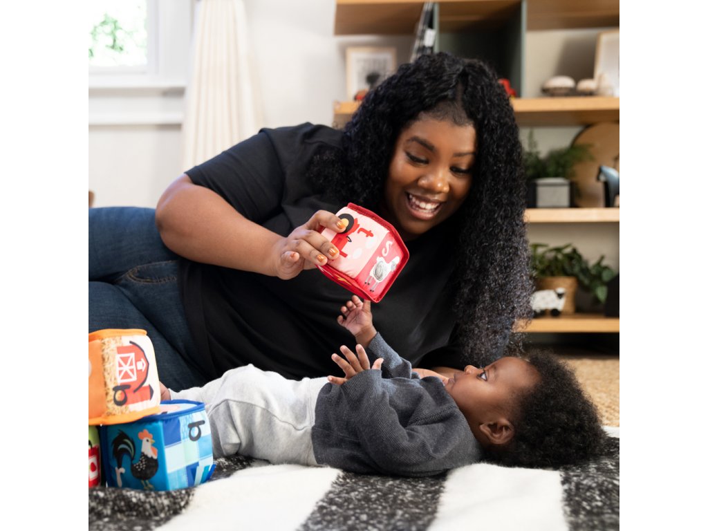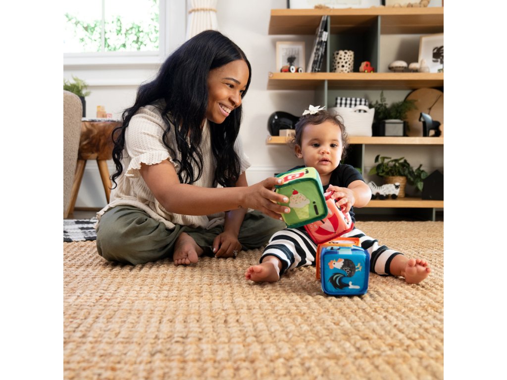 - Navrhnuté pre malé rúčky – ľahké, mäkké kocky sú ideálne na uchopenie, hádzanie a skladanie