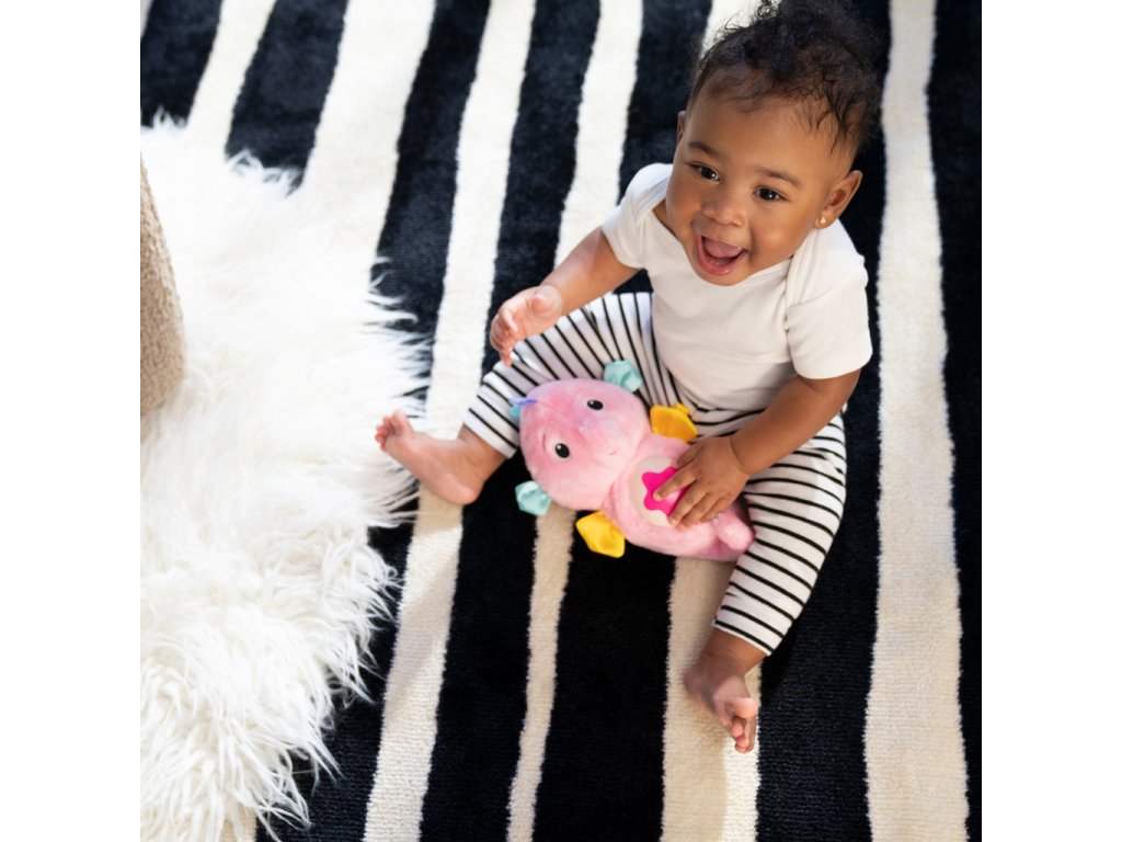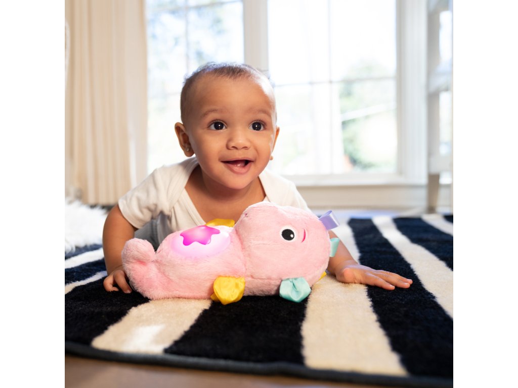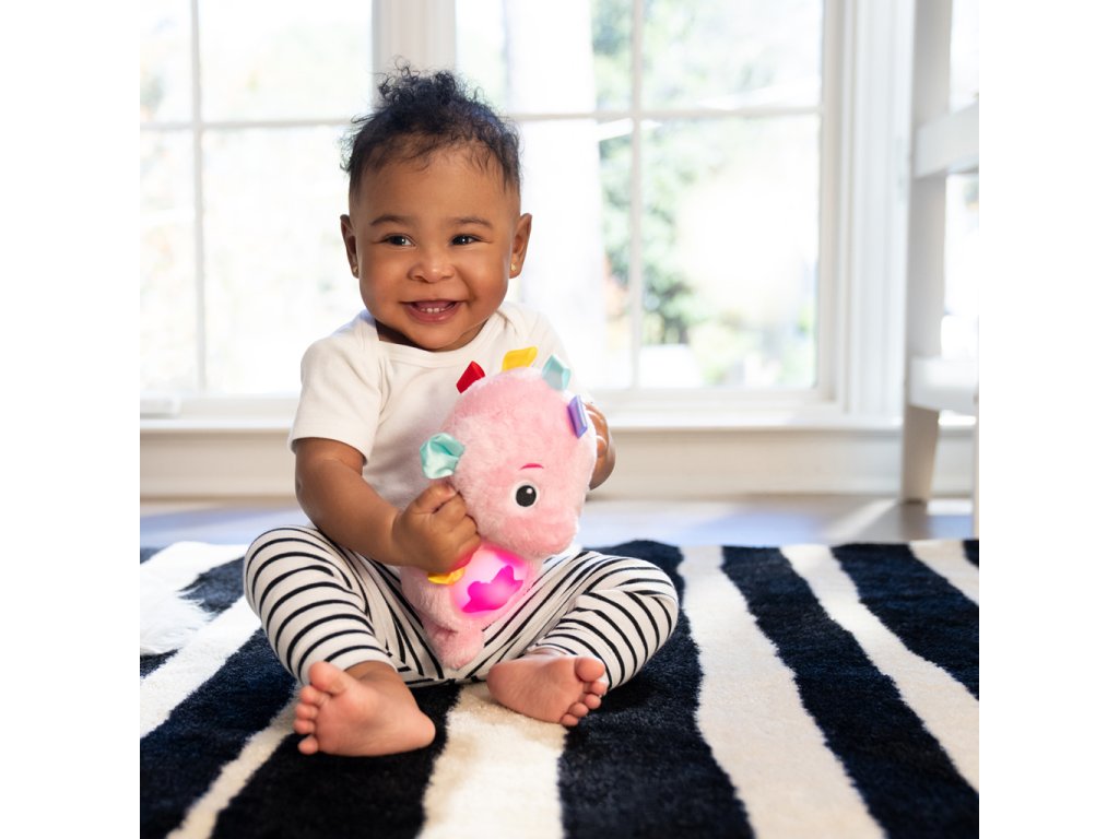 Vďaka technológii reakcie na plač reaguje morský koník na plač dieťaťa – automaticky spustí až 7 minút melódií alebo zvukov oceánu. Dieťatko sa môže naučiť samé upokojiť – stačí jemne stlačiť hviezdičku na brušku koníka, a ten zažiari jemnými farbami (až 5 odtieňov) alebo prehrá až 15 minút klasickej hudby či prírodných zvukov. Na brušku sa nachádza aj držiak na cumlík, aby mal drobček svoj obľúbený cumlík vždy po ruke. Navyše má koník pestrofarebné stužky, ktoré stimulujú hmat a zrak bábätka. Ideálny darček pre deti už od narodenia. Perfektný tip na darček k narodeniu bábätka.