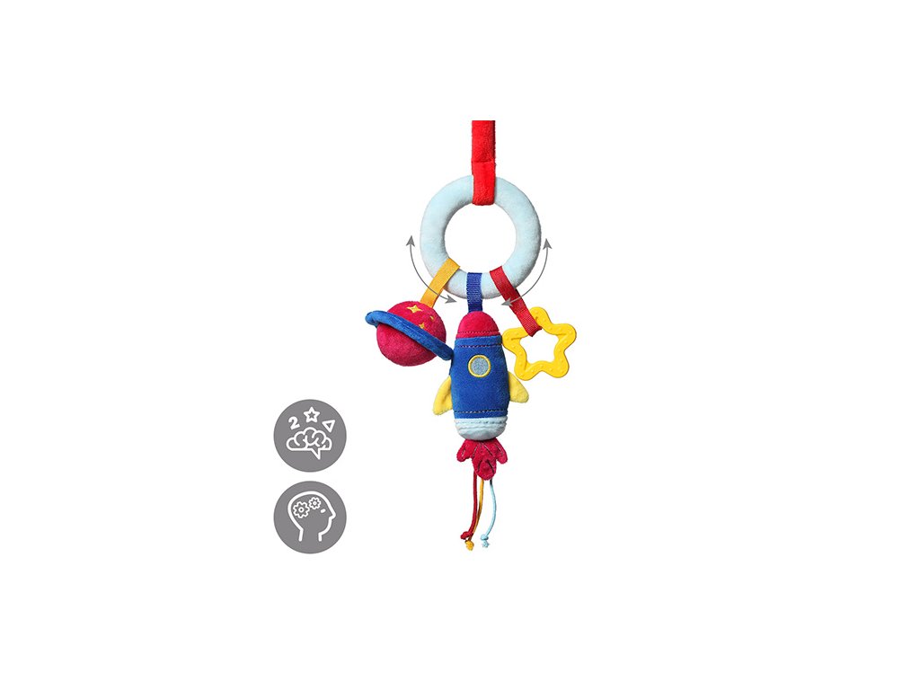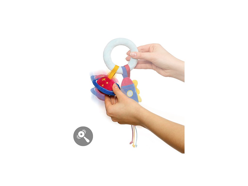Vzdelávacia hračka s dizajnom vesmírnych prvkov zoznámi vaše dieťa s rozmanitým svetom farieb, zvukov a tvarov. Spôsob upevnenia hračky suchým zipsom umožní hračku zavesiť na všetky druhy autosedačiek alebo kočíkov. Vďaka tomu môže dieťa sprevádzať počas cestovania a prechádzok.