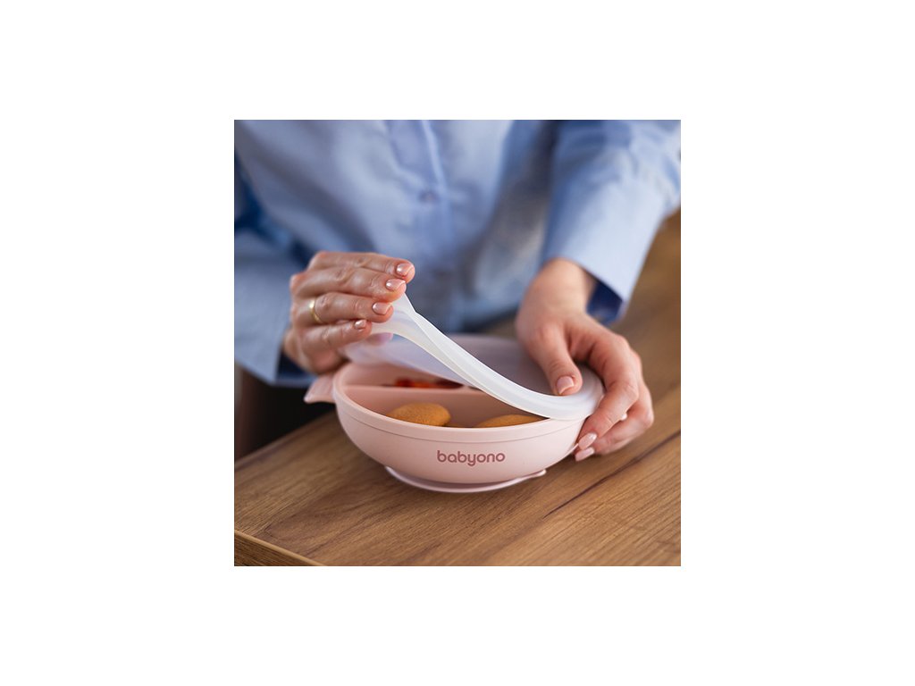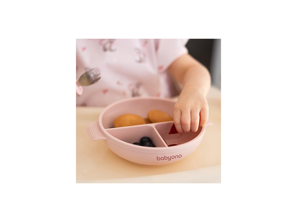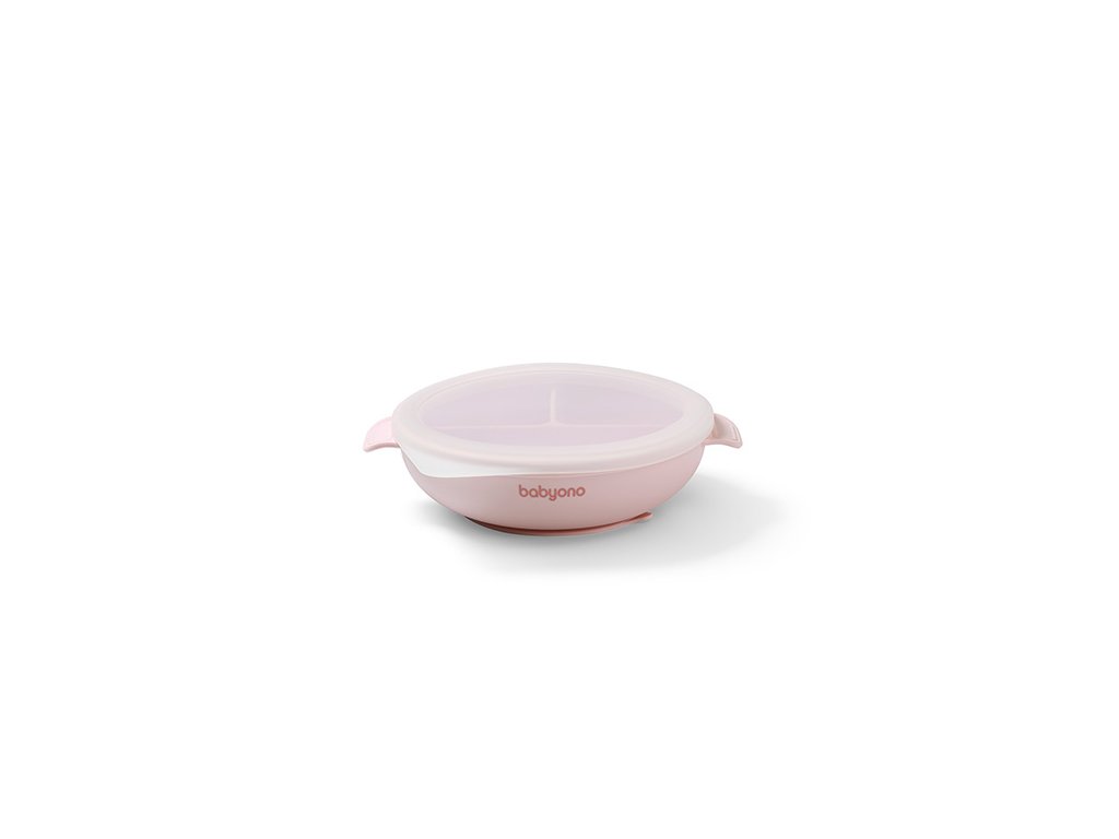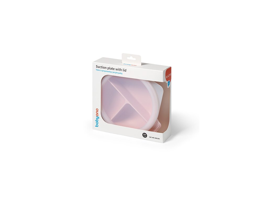 BABYONO Tanier silikónový s prísavkou a viečkom ružový 6m+