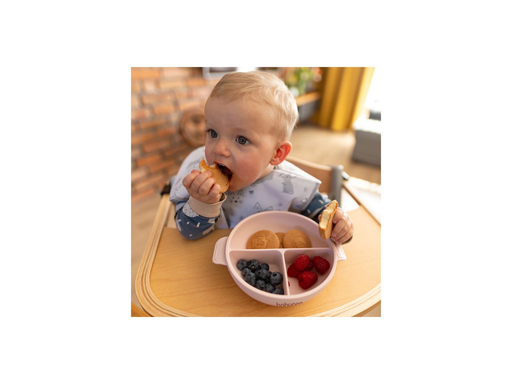 Zavádzate do jedálnička svojho bábätka tuhé jedlo alebo skúšate metódu BLW? Tento silikónový tanierik s tromi priehradkami vám to výrazne uľahčí. Umožní dieťaťu ochutnávať nové chute, podporuje samostatné kŕmenie a vďaka prísavke udrží tanier pevne na mieste – bez rizika prevrátenia. Viečko udrží jedlo teplé a čerstvé, takže môžete pripraviť jedlo vopred alebo uschovať zvyšky na neskôr. Tri samostatné priehradky umožňujú servírovať rôzne druhy jedál bez miešania chutí. Zaoblené okraje a vyššie steny uľahčujú naberanie jedla, či už rukou alebo príborom. Tanier aj viečko sú vyrobené z odolného, netoxického silikónu bez BPA, ktorý môžete používať v mikrovlnnej rúre aj umývačke riadu.