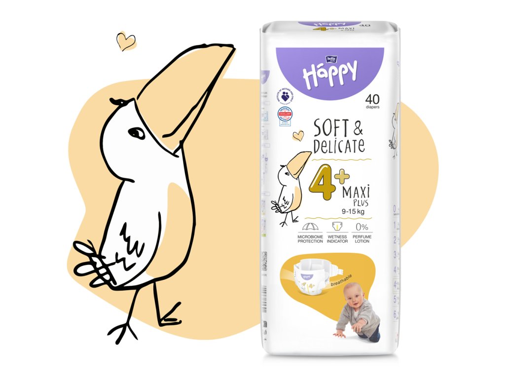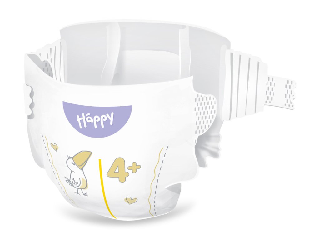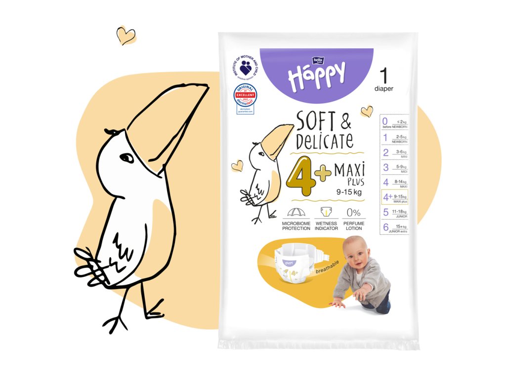 Detské plienky Happy Soft & Delicate Maxi Plus (4+) sú odporúčané pre novorodenca s hmotnosťou 9-15 kg. Sú vyrobené z najkvalitnejších materiálov, dokonale sa prispôsobia telu dieťatka a poskytujú príjemný pocit sucha. Sú navrhnuté tak, aby vyhovovali potrebám tej najcitlivejšej pokožky – neobsahujú žiadne alergény a minimalizujú riziko vzniku zaparenín.