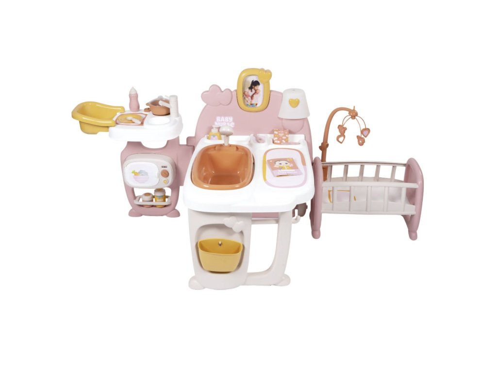 Hracie centrum pre bábiky Baby Nurse s 3 hracími zónami je vybavené transportnými kolieskami, rukoväťou a je skladacia pre ľahkú prepravu. Po otvorení prekvapí tromi priestrannými hracími kútikmi: kuchynkou, kúpeľňou a spálňou. Umývací priestor je vybavený odnímateľnou vaničkou, hneď vedľa je prebaľovací pult, ktorý zároveň slúži ako šatňa. Pod komodou je vešiak na uteráky, háčik na kabát a vyberateľný odpadkový kôš. Rám obrazu na zadnej stene je možné prispôsobiť vlastnými fotografiami. Jedálenský kút so sedadlom pre bábiky má drez s batériou (nefunkčný), varnú dosku, mikrovlnnú rúru a odkladacie police. Spacia časť obsahuje postieľku pre bábiky, otočný kolotoč a fosforeskujúcu lampu. Príslušenstvo: fľaštičky, taniere s lyžičkami, hrnce, klinické teplomery a rôzne nádoby a prázdne obaly na hranie. Vhodné pre bábiky do 42 cm (bábika nie je súčasťou balenia). Tento výrobok obsahuje minimálne 78 % recyklovaného materiálu. Rozmery zloženého produktu (DxŠxV): 68 x 71 x 71 cm. Rozmery produktu v rozloženom stave (DxŠxV): 149 x 71 x 71 cm.