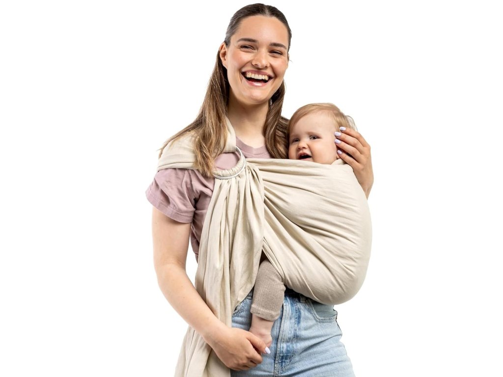Jednoduché a Rýchle použitie: Je to Ring Sling bez viazania – stačí pretiahnuť látku cez krúžky a dotiahnuť.
