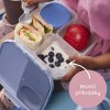 Silikónové tesnenie potom dovolí skladovať v menších oddeleniach jogurt alebo dip (nie tekutiny). Jedna z vnútorných "prepážok" je vyberateľná a nastaviteľná, takže si tento desiatový box prestavíte podľa svojich chutí a potrieb. Do krabičky sa zmestí napríklad aj wrap alebo banán. Je len na vás, čo dieťaťu alebo sebe do tohto desiatového boxu zabalíte. Jednoduché otváranie umožní deťom samostatne sa obslúžiť.