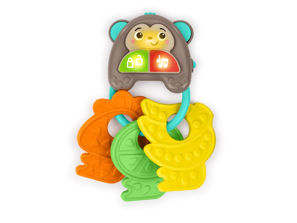 Zábavná hračka umožní dieťatku cítiť sa a robiť veci ako mama a otec s vlastnou sadou kľúčov. Obsahuje viac ako 10 veselých zvukov áut, svetiel a melódií, ktoré podnecujú zmysly a rozvíjajú motorické schopnosti. Táto interaktívna hračka je ideálna na doma aj na cesty. Obsahuje milého opičieho kamaráta, tri farebné tlačidlá a textúrované kľúče v tvare ovocia. Pomáha rozvíjať hmat, sluch a zrak bábätka a podporuje učenie sa príčiny a následku. Hračka je ľahká, prenosná a zmestí sa do väčšiny tašiek na plienky.