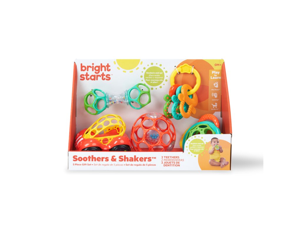 - Darčeková sada Bright Starts Soothers & Shakers obsahuje 5 hračiek a hryzačiek; hryzačky pomáhajú bábätku upokojiť boľavé ďasná vďaka rôznym textúram; hrkálky a hračky Oball sú ľahko uchopiteľné a jednoducho sa trasú