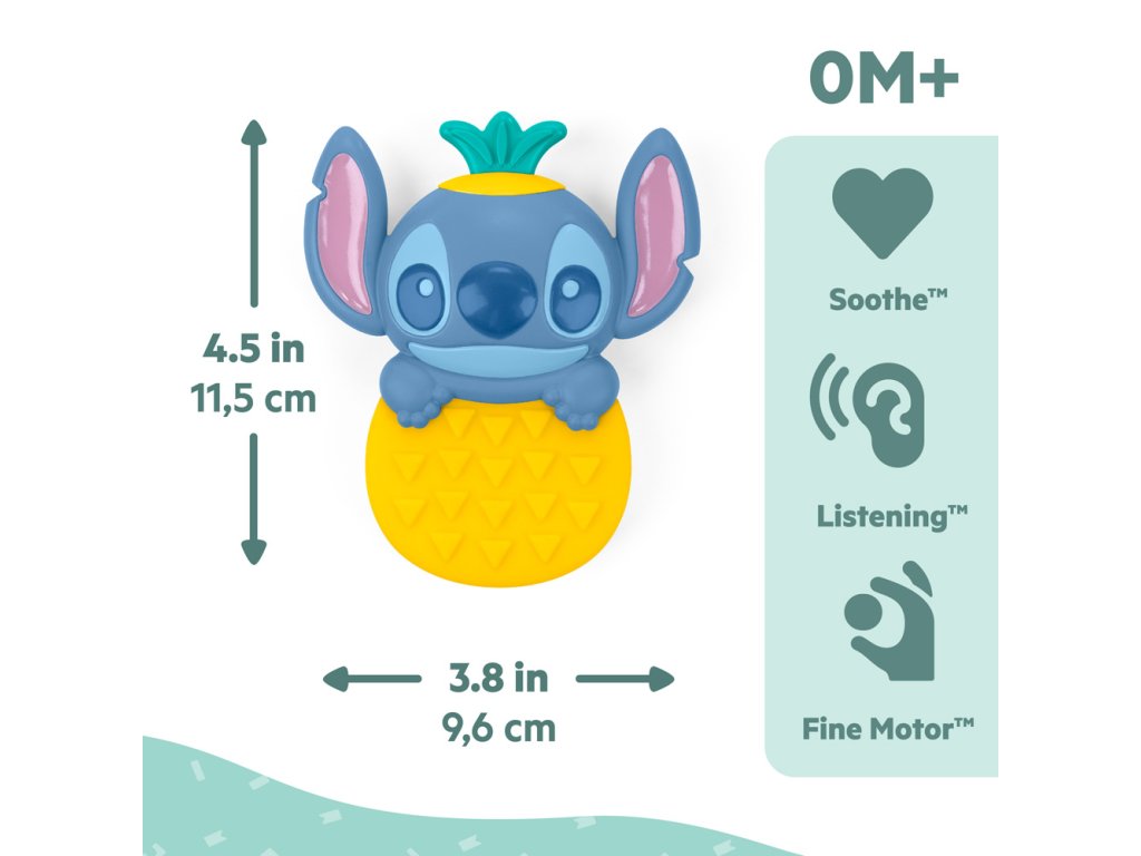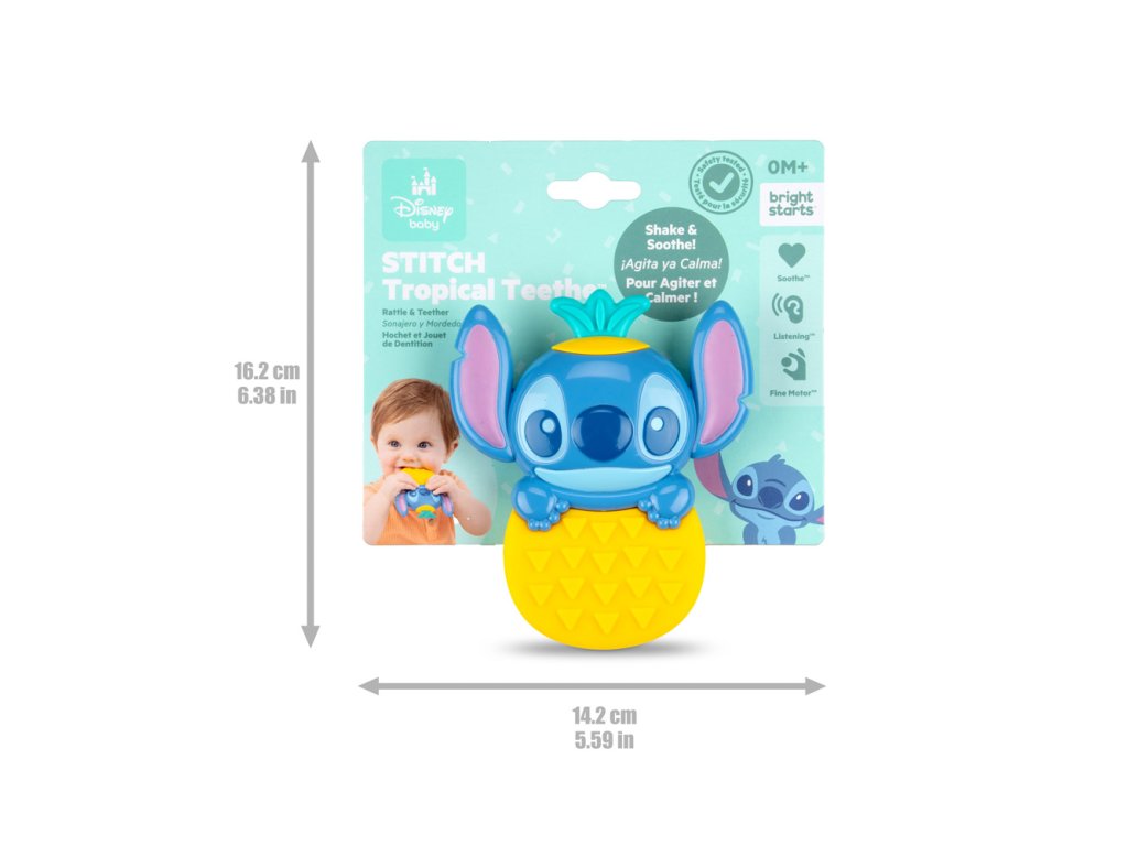 Ochutnajte sladký život s hryzačkou Stitch od Bright Starts! Táto roztomilá kombinácia hryzačky a hrkálky v tvare ananásu prináša úľavu od boľavých ďasien a zároveň zábavu počas hry. Textúrovaný povrch hryzačky upokojuje citlivé ďasná, zatiaľ čo vstavaná hrkálka s korálkami povzbudzuje sluchové vnímanie. Rozkošná tvárička Stitcha vykúkajúca z ananásu poteší nielen bábätká, ale aj rodičov, ktorí ocenia praktický a ľahký dizajn ideálny na cesty. Hračka je navrhnutá pre deti od narodenia a ľahko sa zmestí do prebaľovacej tašky alebo kočíka – vždy poruke, keď príde čas na upokojenie či zábavu.