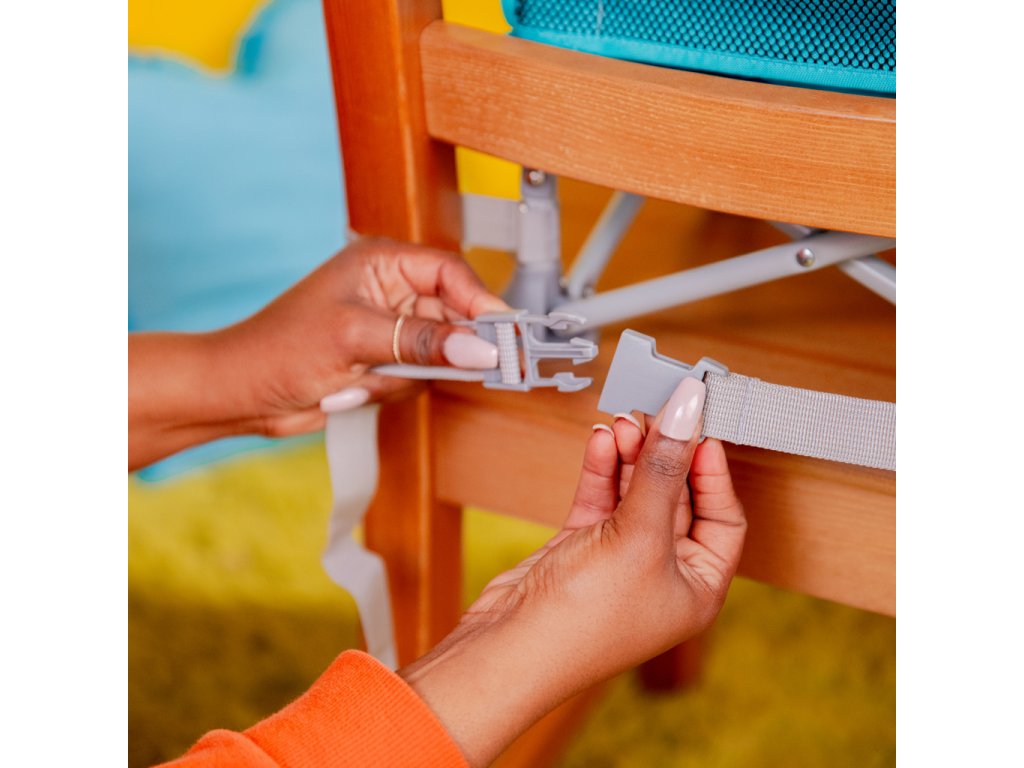 - Neutrálne sivé farebné prevedenie; obsahuje 3-bodový bezpečnostný pás, pultík a bezpečnostné popruhy na upevnenie ku stoličke pre dospelých