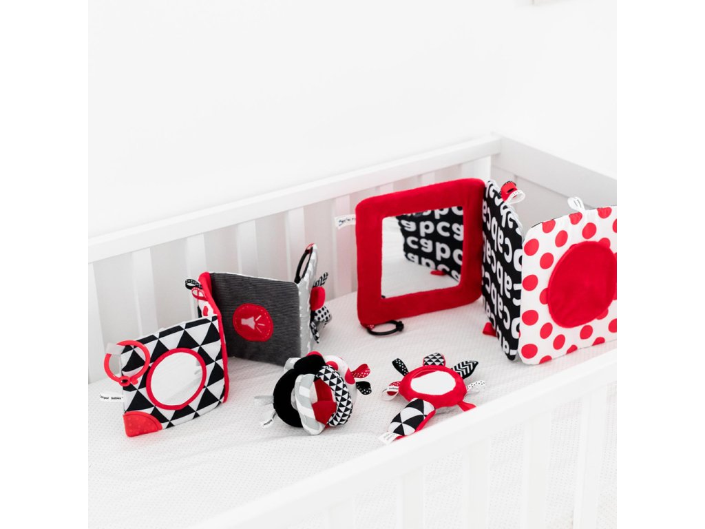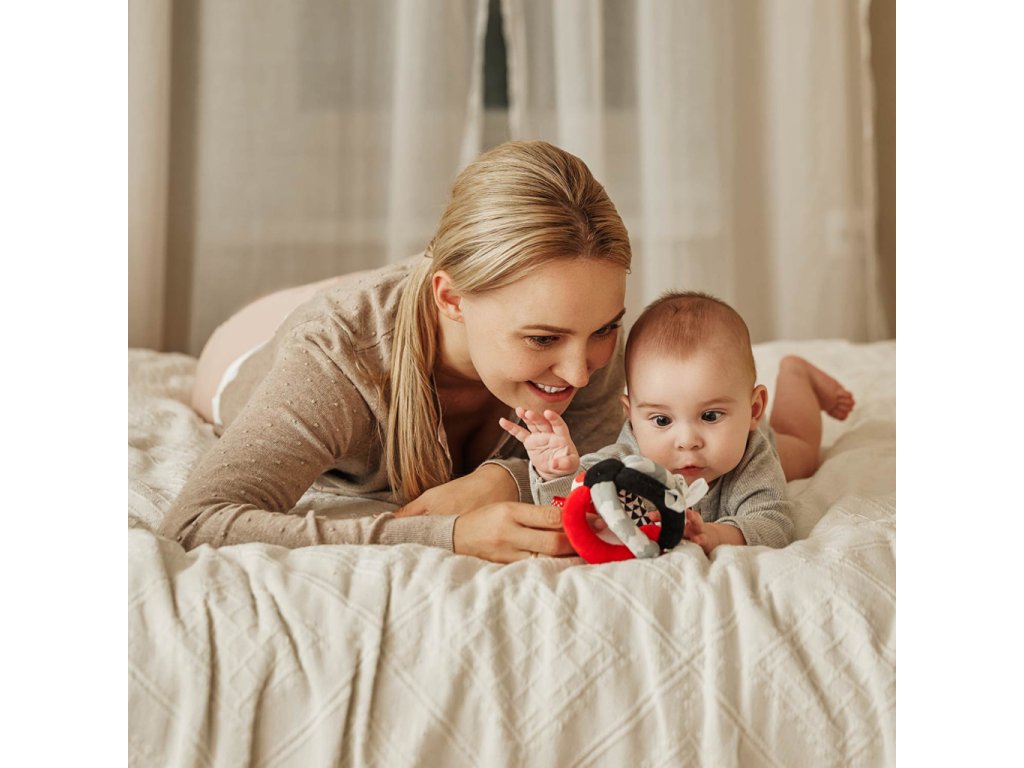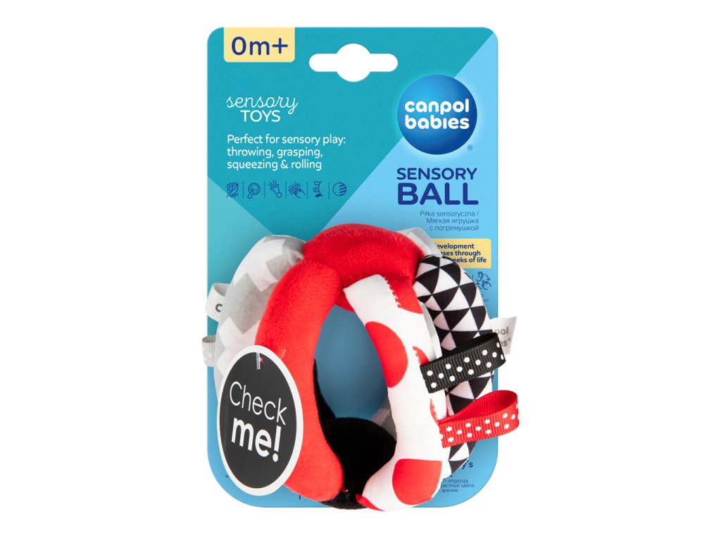 Kontrastná loptička s hrkálkou SENSORY. Vďaka praktickému tvaru je možné hračku jednoducho uchopiť. Disponuje šuštiacimi elementmi, hrkálkou a látkovými stužkami. Senzorické farby stimulujú rozvoj zmyslov dieťaťa.