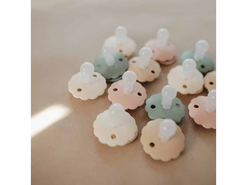 Silikónový cumlík, vhodný pre deti od 6 mesiacov, so vzorom kvietka.