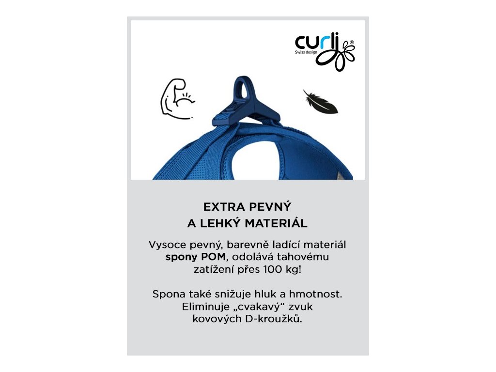 Postroj je vyrobený z ľahkého vzdušného materiálu Air-Mesh pre pohodlné nosenie. Možnosť nastavenia veľkosti postroja pomocou suchého zipsu. Postroj je vyrobený tak, aby došlo k optimálnemu rozloženiu napätia a aby nedochádzalo k poraneniu krku. Polstrovaná pracka zabezpečuje, aby sa srsť nezachytávala ani nedráždila.