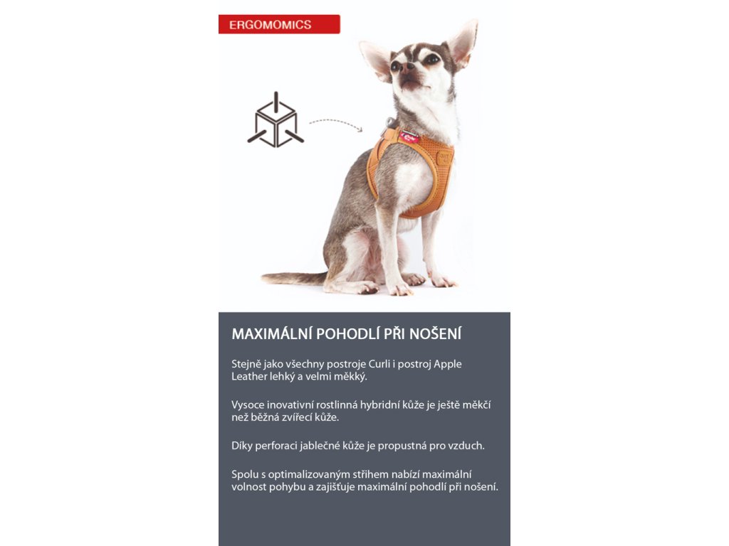 Rovnako ako všetky postroje Curli je aj tento postroj veľmi ľahký a veľmi mäkký. Vysoko inovatívna rastlinná hybridná koža je ešte mäkšia ako bežná zvieracia koža.