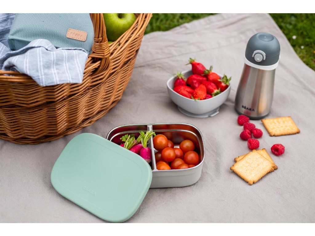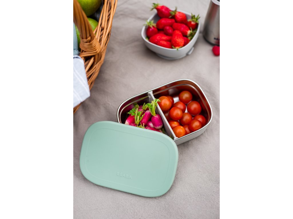 Nerezový desiatový box je ideálny na prenášanie a uchovanie detskej desiaty či obeda. Dve vnútorné odnímateľné silikónové prepážky umožňujú oddeliť jednotlivé časti desiaty. Silikónový odnímateľný poťah uľahčuje uchopenie a chráni box pred poškodením. Silikónové viečko bezpečne chráni obsah boxu.