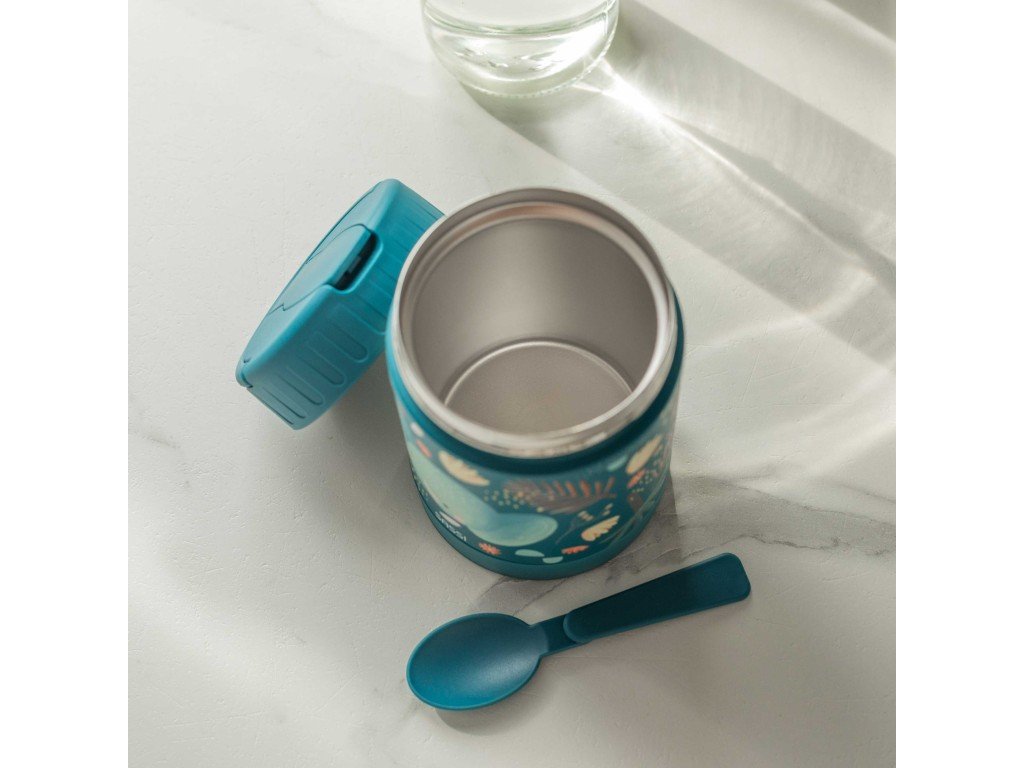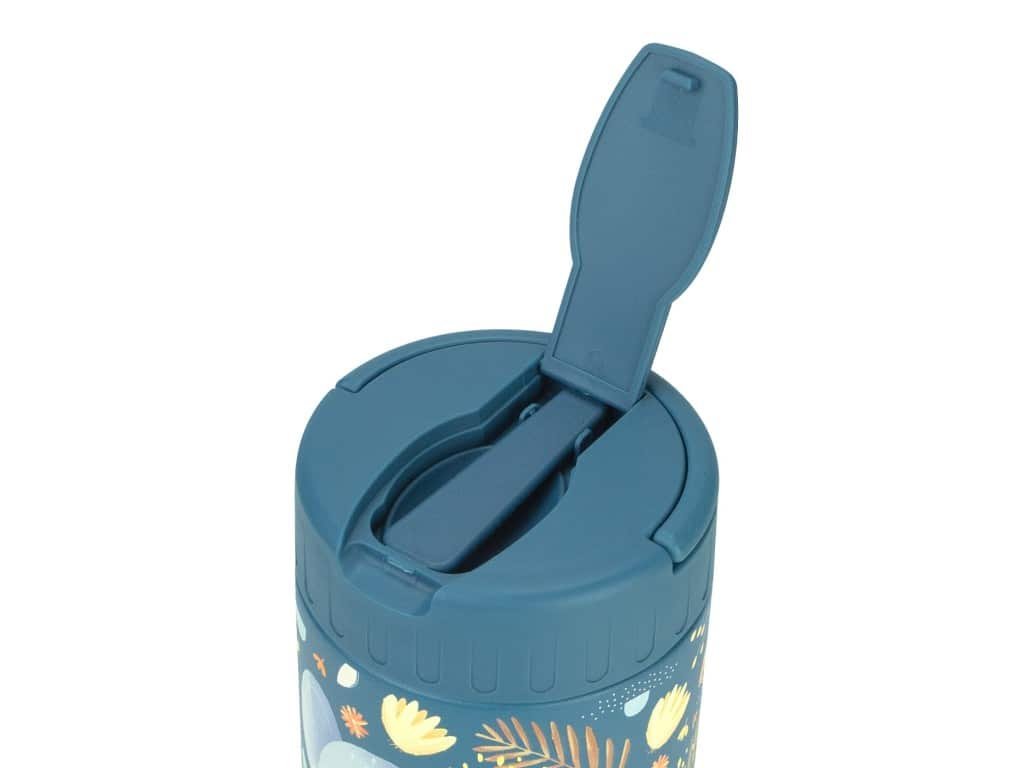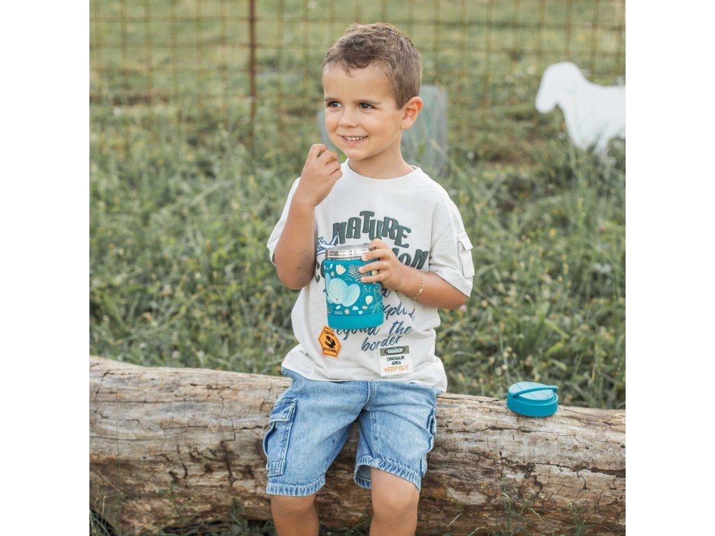 Termoska na jedlo s motívom múdreho sloníka Chewyho je ideálna na udržiavanie detských jedál teplých doma, v škôlke alebo na cestách. Vyrobená z kvalitnej nehrdzavejúcej ocele s dvojitou stenou, udrží jedlo teplé (alebo studené) celé hodiny a zabezpečí, že bude vždy chutné a pripravené na podávanie. Vzduchotesné viečko a kompaktný dizajn umožňujú bezpečné prenášanie v batohu či taške. Táto izolovaná termoska je ideálna na prvé príkrmy, polievky alebo pyré, ľahko sa čistí a je úplne bez BPA a PVC.