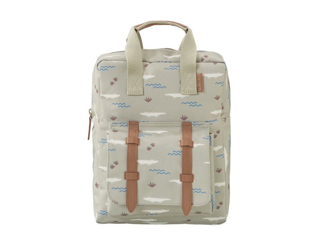 Roztomilý detský ruksak z recyklovaných PET fliaš so vzorom krokodílov v zelenej farbe.
