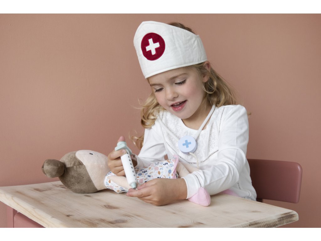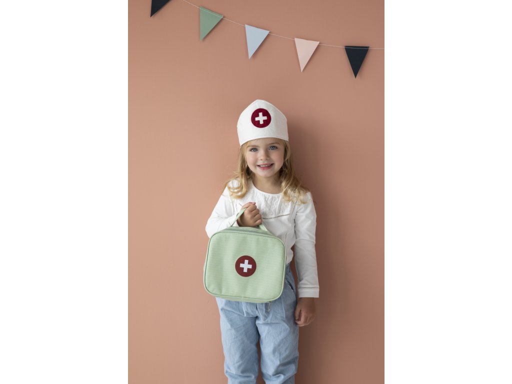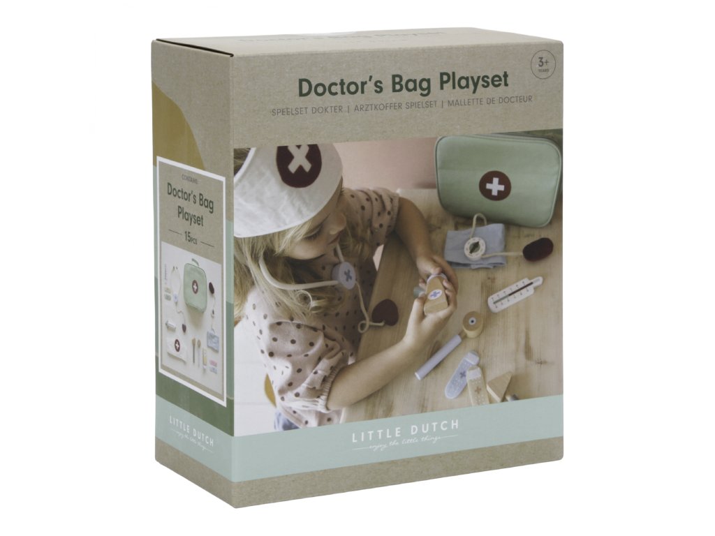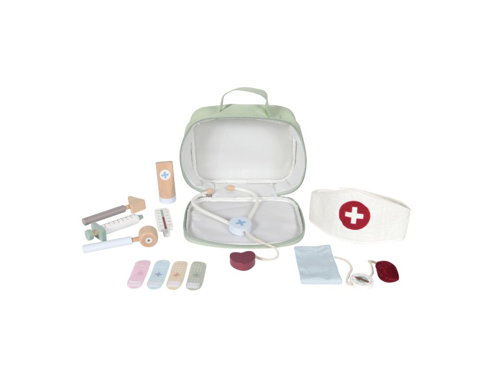 Sada obsahuje: plátenú lekársku tašku, náplaste (4 rôzne farby), teplomer, striekačku, tubu s masťou, stetoskop, reflexné kladivko, tlakomer, otoskop a lekársku čiapku.