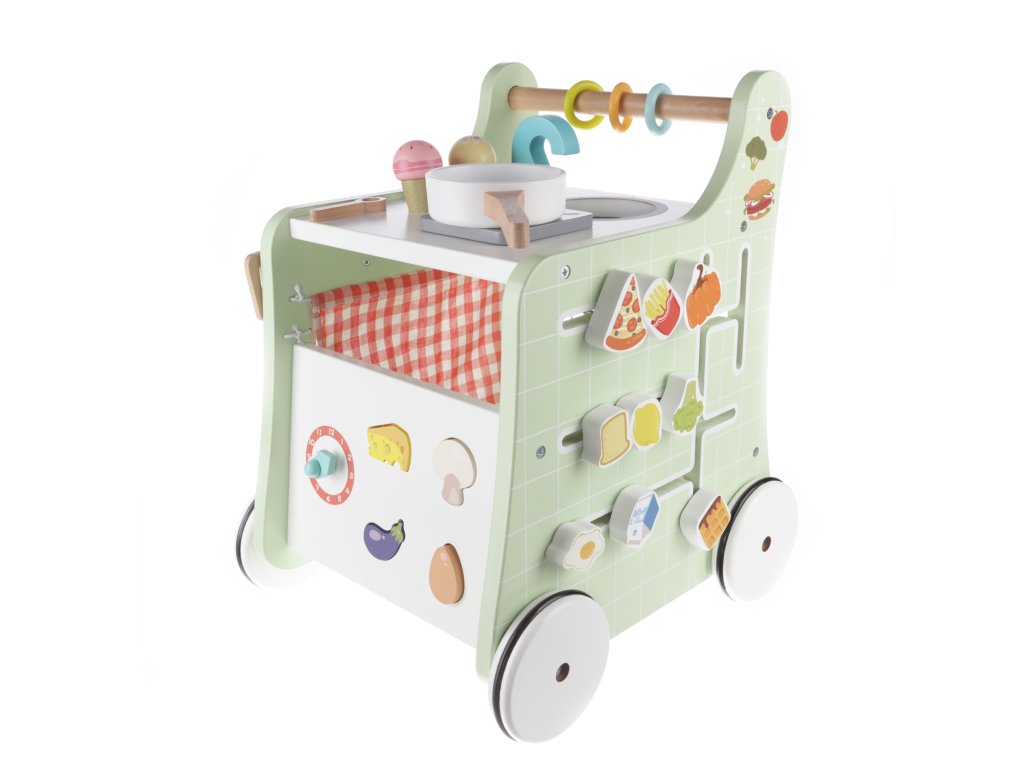 drevená rukoväť, ktorej sa dieťa môže držať. Štyri tiché kolieska potom pomáhajú