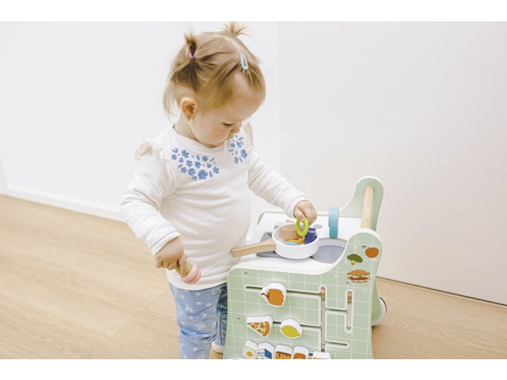 kuchyňa ako interaktívna hračka. Na vrchu nájdeme drevený sporák s panvicou a