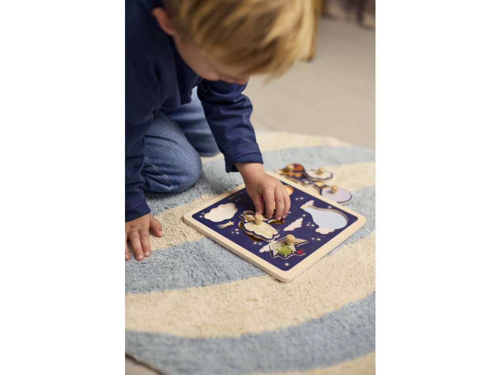 Drevená skladačka obsahuje 5 dielikov, pričom každý motív pod sebou ukrýva senzorickú látku. Pevné úchyty umožňujú malým prstom ľahké uchopenie, podporujú rozvoj jemnej motoriky a posilňujú pinzetový úchop. S rozmermi 22,5 × 22,5 cm kombinuje hmatové objavovanie s riešením problémov a je ideálnou aktivitou pre deti od 12 mesiacov.
