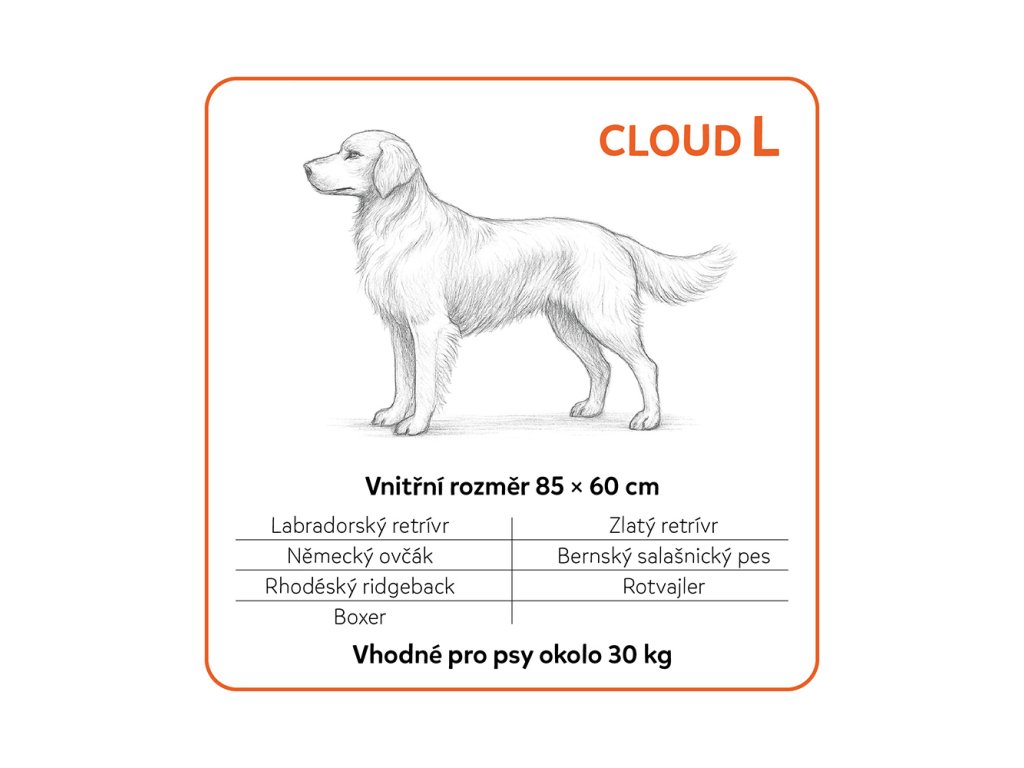 Cloud L je ortopedický pelech pre psov navrhnutý tak, aby poskytoval stabilnú oporu, úľavu kĺbom a maximálne pohodlie – každý deň. Dvojvrstvá matrac, kvalitné materiály a funkčná konštrukcia robia z Cloudu ideálne miesto na spánok aj regeneráciu.