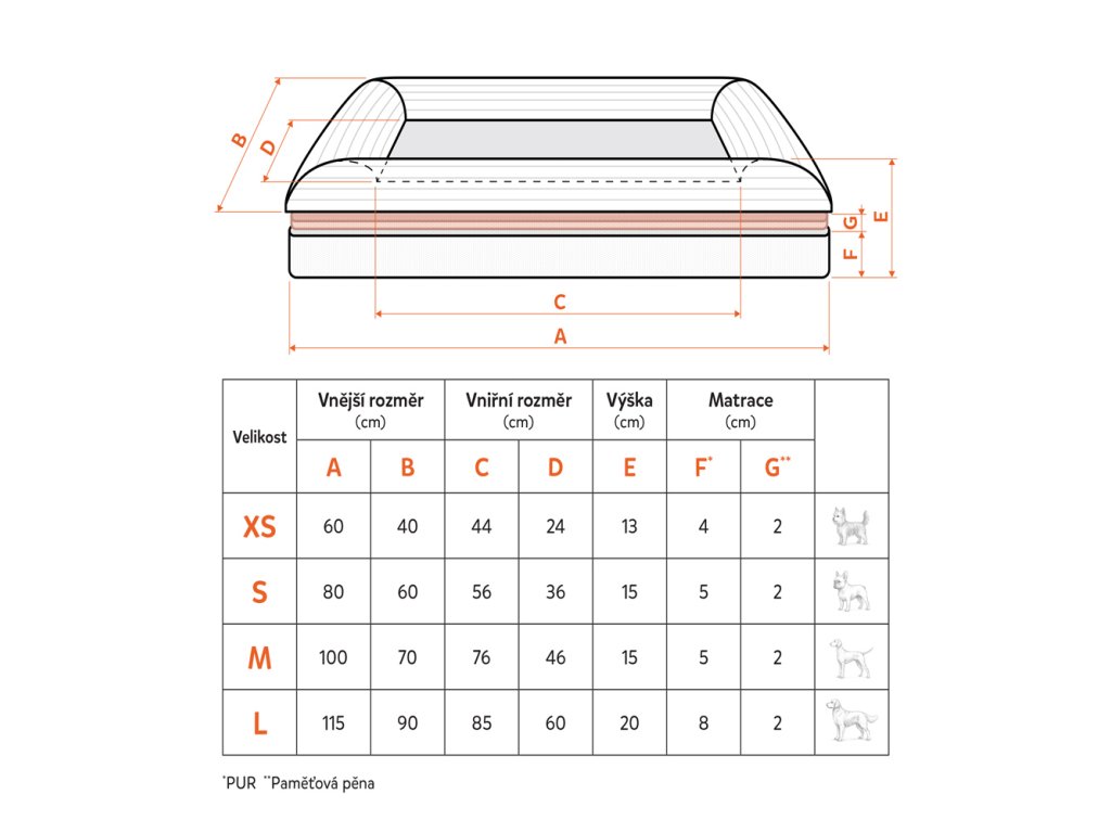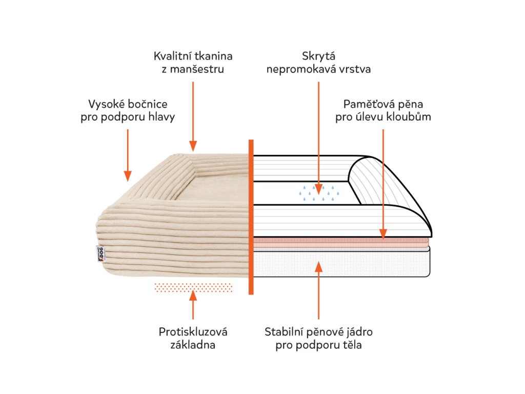 Jadro pelechu tvorí 8 cm vysoká polyuretánová pena (PUR) o hustote 25D, ktorá slúži ako pevná a odolná základňa. Na nej leží 2 cm pamäťovej peny o hustote 40D, ktorá sa prispôsobí tvaru tela psa, rovnomerne rozloží tlak a uľaví kĺbom aj chrbtici. Celková výška matrace je 10 cm, čo zaisťuje pohodlie bez nadmerného prepadania a zároveň uľahčuje pohyb v pelíšku.