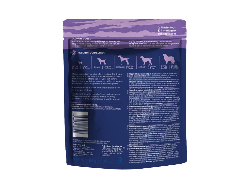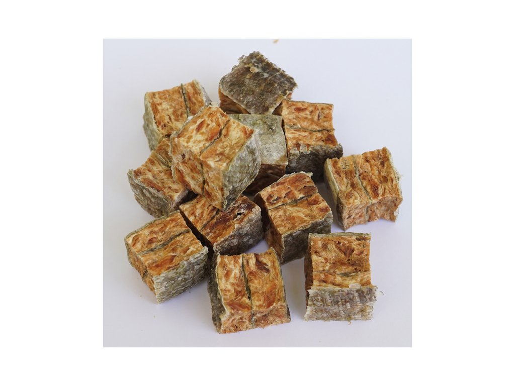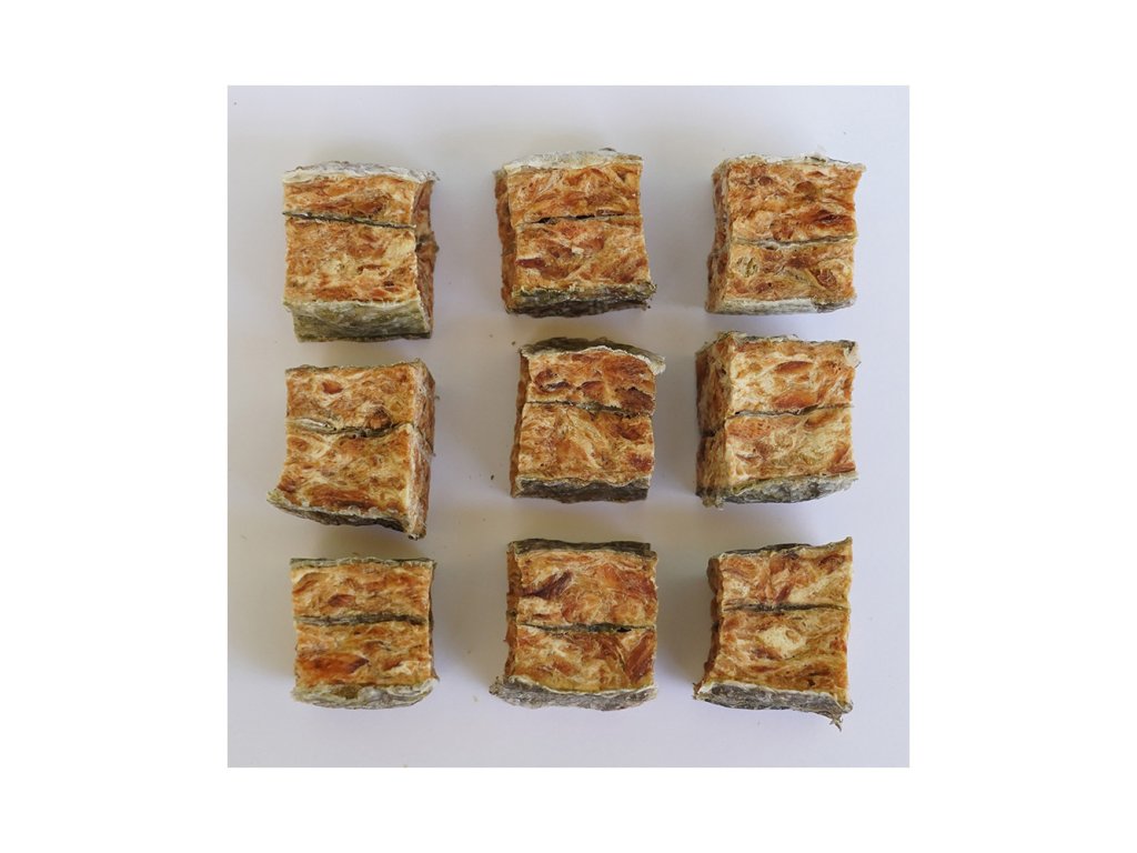 Zloženie: Losos (85 %), rybia koža (6 %), rastlinný proteín, škrob, glycerín