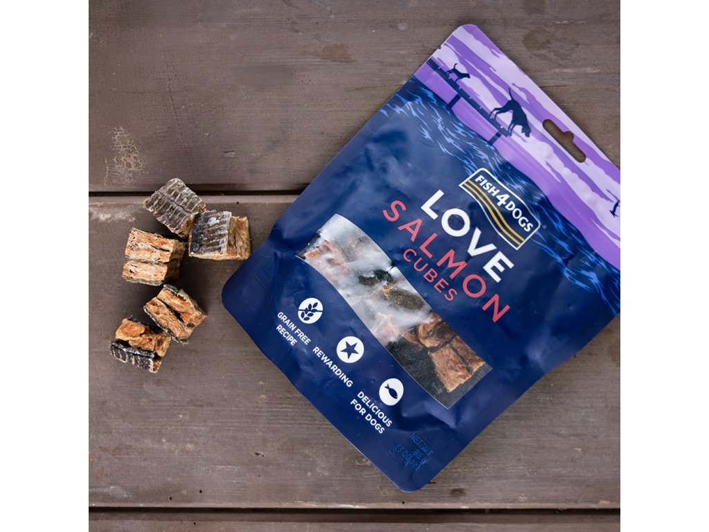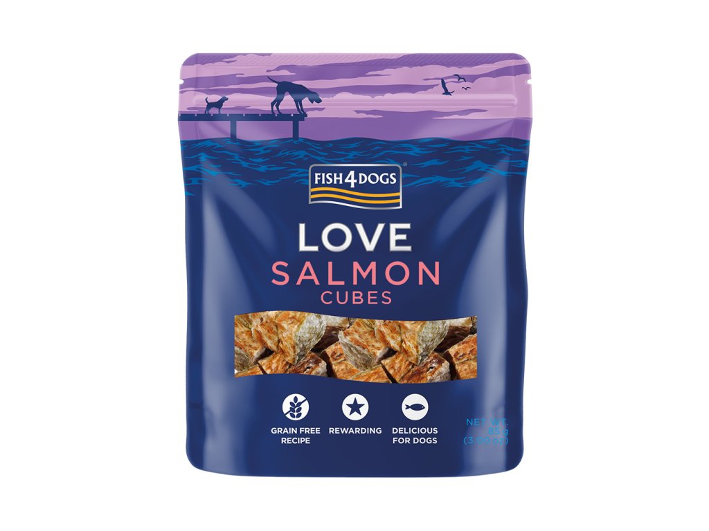 FISH4DOGS Maškrty pre psov LOVE s lososom - kocky 85 g