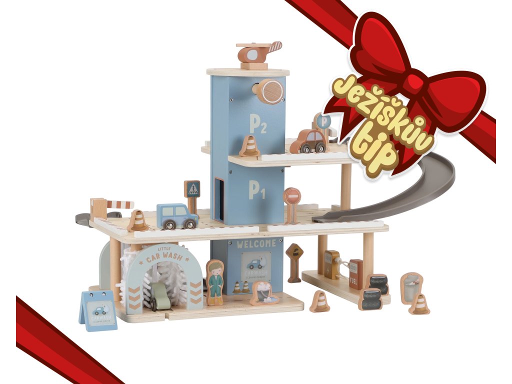 Zaparkuj, natankuj a hurá na výlet! Garáž má prízemie s umývačkou, dve poschodia na parkovanie, nabíjaciu stanicu pre elektromobily a pristávaciu plochu pre vrtuľník na streche. V balení ďalej nájdete tri drevené autíčka, vrtuľník, figúrku vodiča a ďalšie doplnky (dopravné značky, kužele, pneumatiky, vedro atď.).