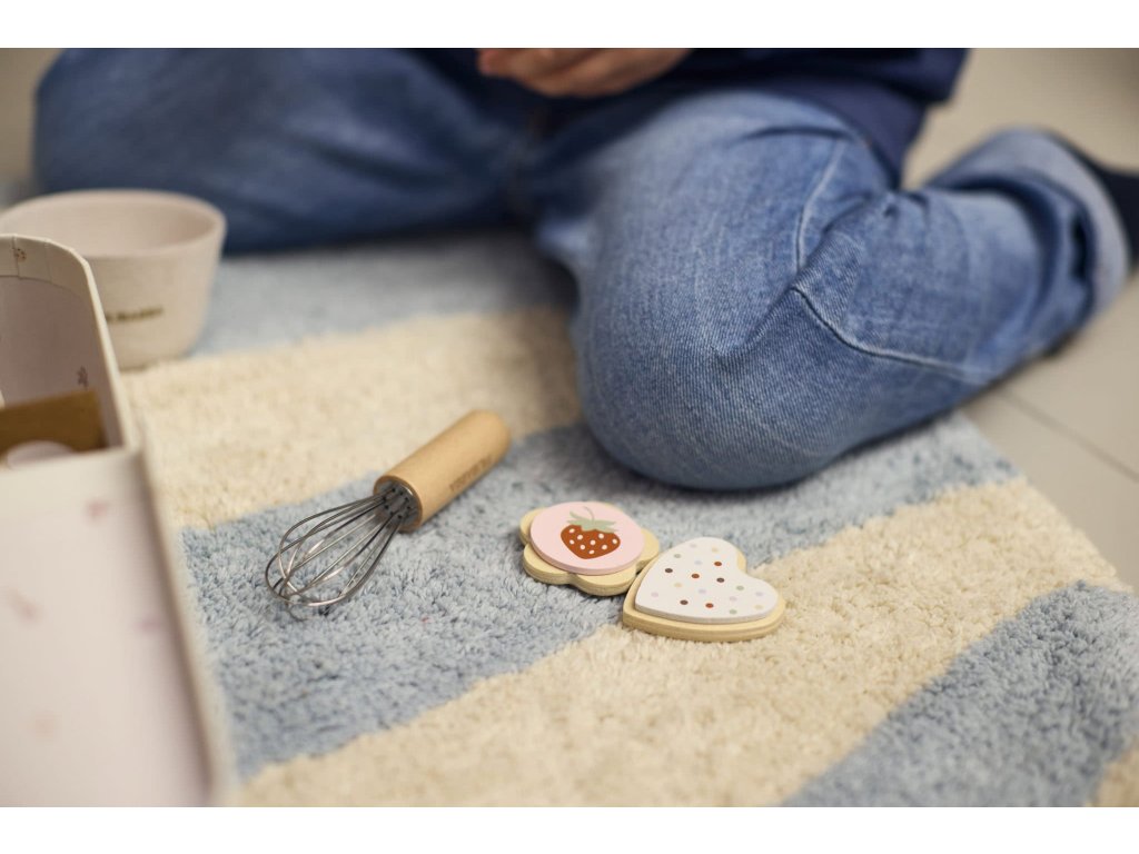 Súprava obsahuje niekoľko základných nástrojov na pečenie: vykrajovačky, sušienky, cesto, metličku, mixovaciu misu, valček a stierku. Všetko je uložené v odolnom kartónovom kufríku s kovovými rúčkami a pántmi, takže súprava je praktická aj dekoratívna. Je ideálna na udržiavanie poriadku doma alebo na to, aby ste si ju zobrali so sebou na dobrodružstvá mimo domov. Súprava podporuje kreativitu, hranie rolí a rozvoj jemnej motoriky.
