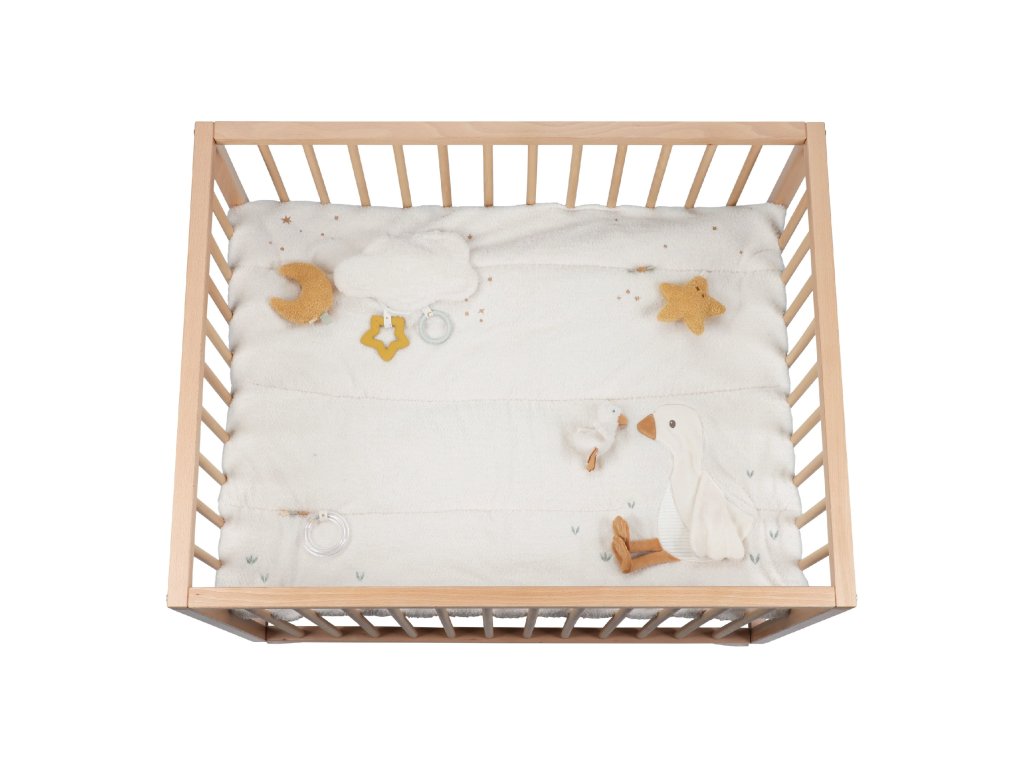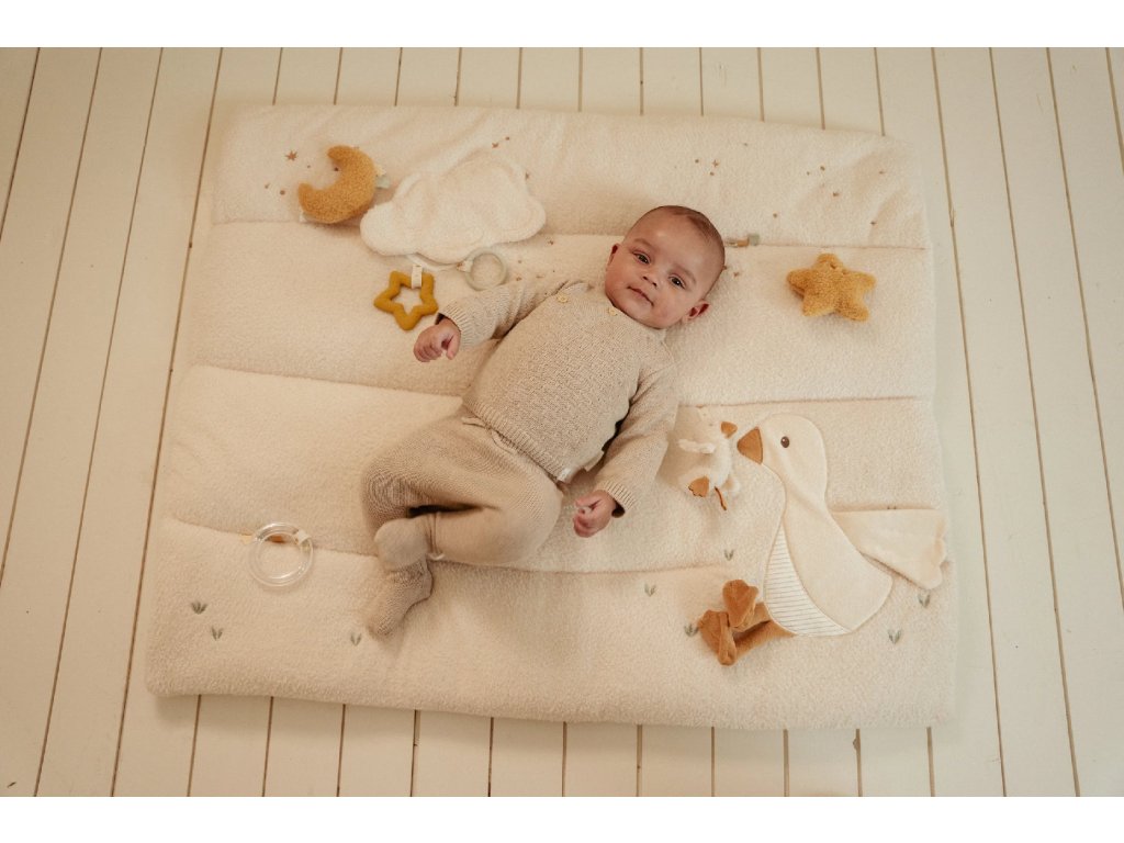 Mäkká hracia deka v jemných prírodných farbách ponúka pohodlie a rôznorodé aktivity na zabavenie vášho dieťaťa. Na deke nájdete plyšovú hus s husátkom, mráčik s bezpečným zrkadlom, hviezdu, mesiac aj hrkajúce krúžky a hryzátko.
