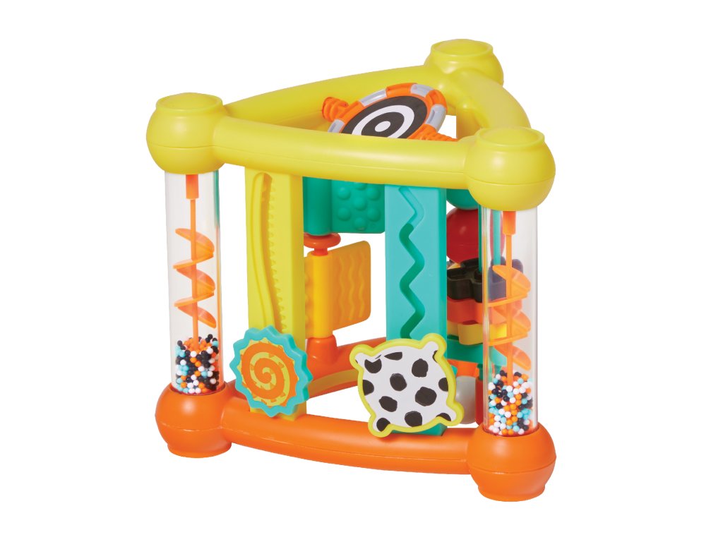Farebný hrací pultík obsahuje množstvo rôznorodých aktivít na skúmanie.