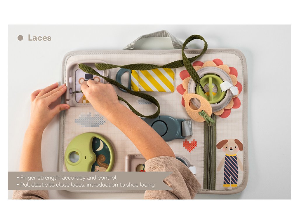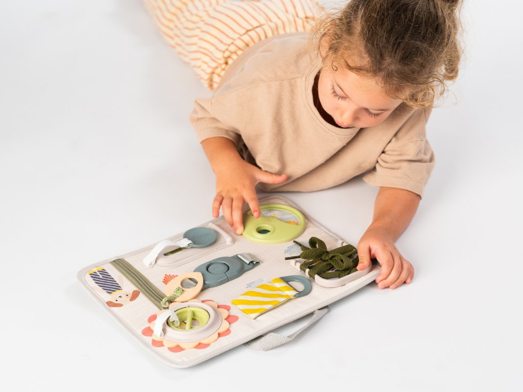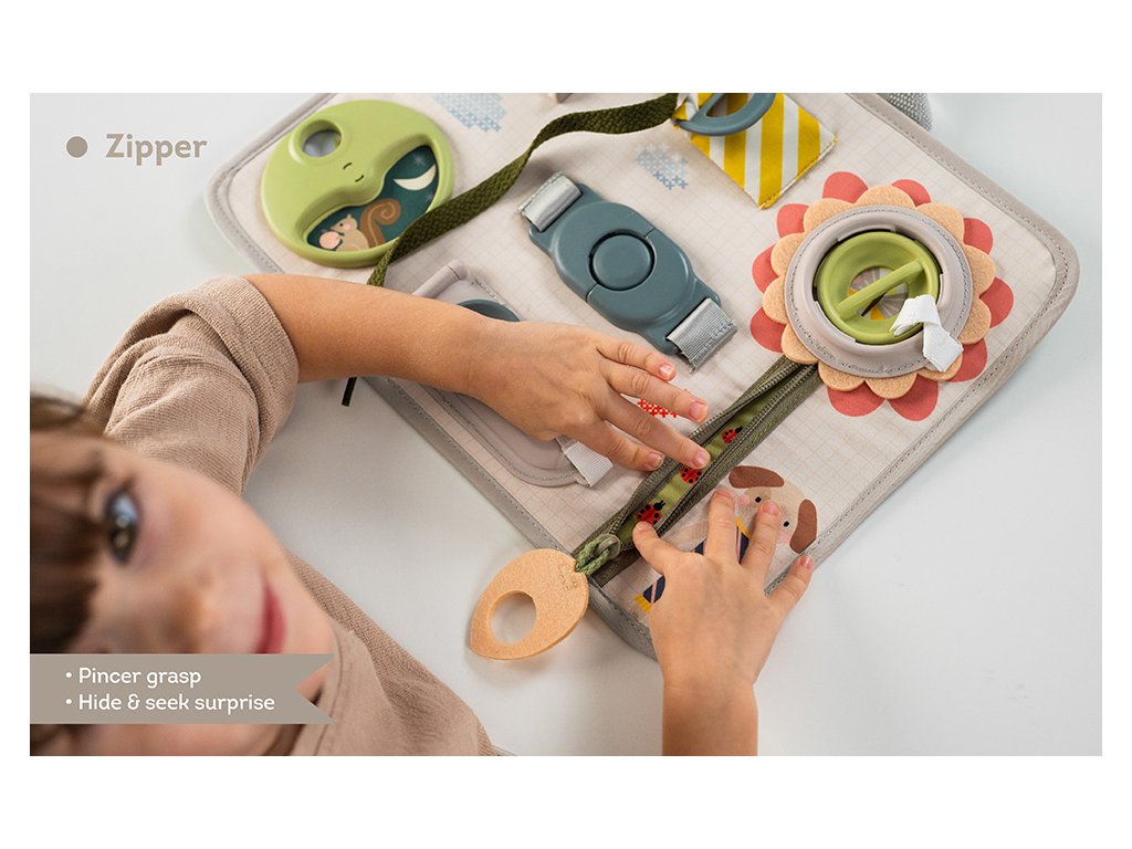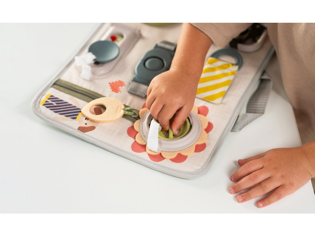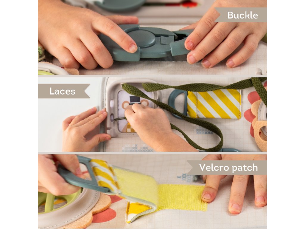 Originálny hrací pult ponúka množstvo rôznorodých aktivít, medzi ktorými nájdete zips, veľký gombík, suché zipsy šnúrky, pracku, pútko a mnoho ďalšieho. Zapínaním a rozopínaním si deti precvičujú jemnú motoriku aj koordináciu oko-ruka. Aktivity zároveň podporujú rozvoj kreativity dieťaťa aj jeho schopnosti riešiť problémy.