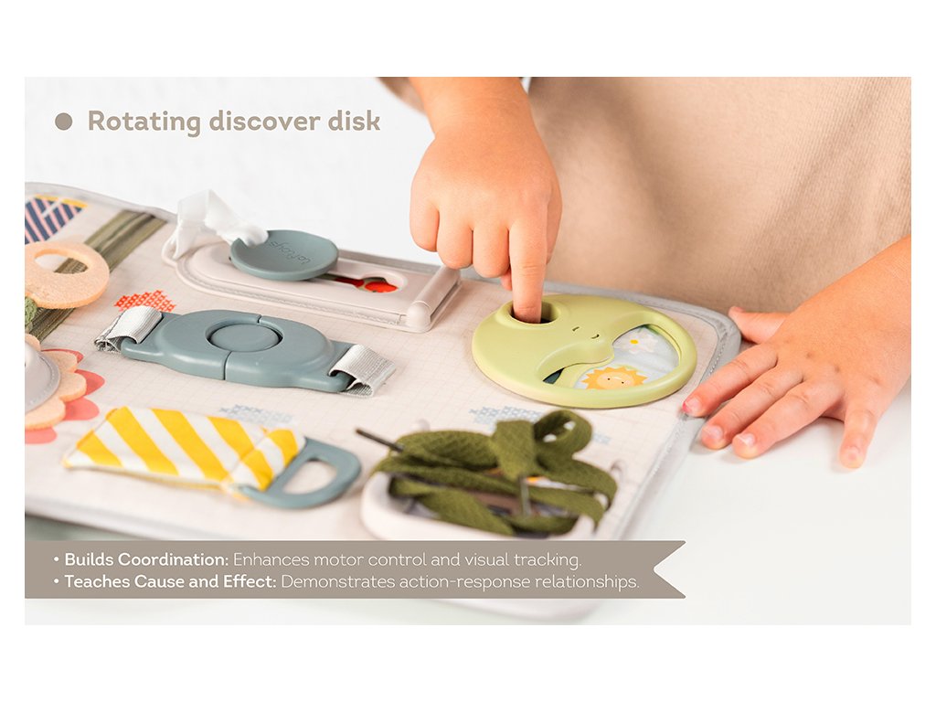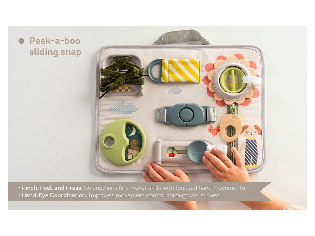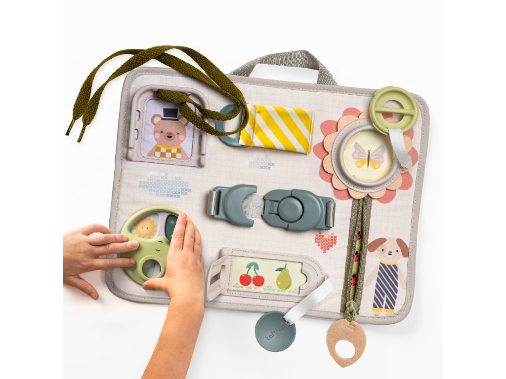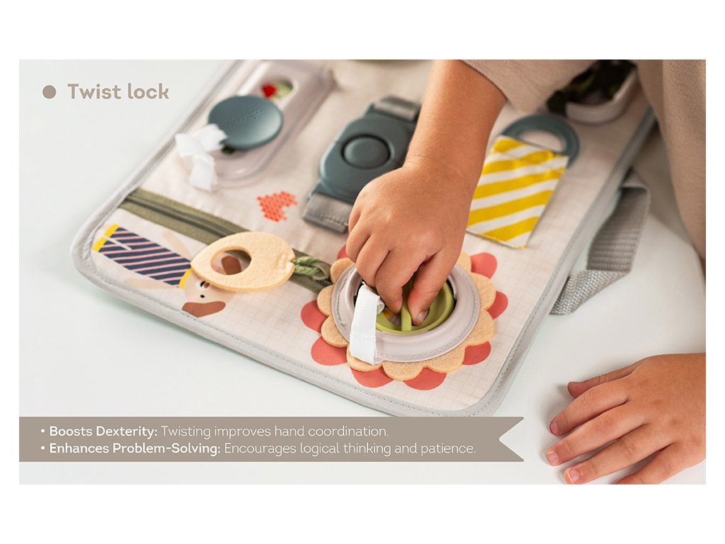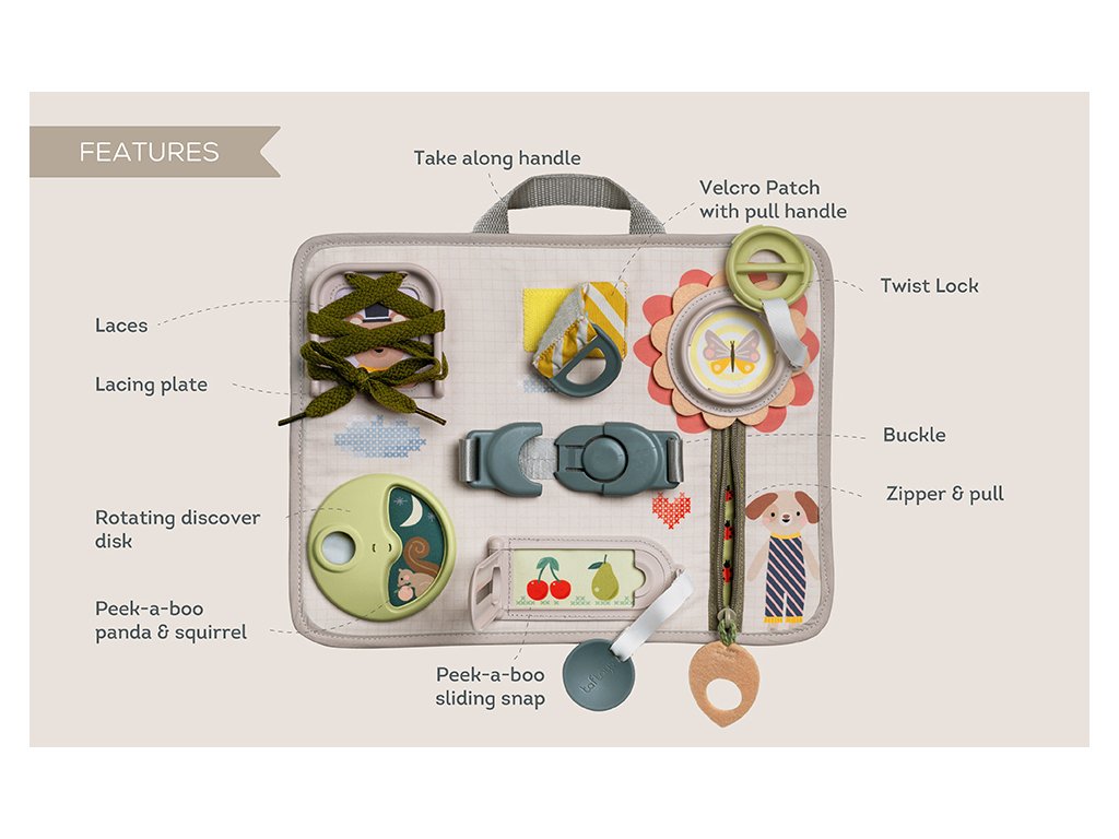 Originálny hrací pult ponúka množstvo rôznorodých aktivít, medzi ktorými nájdete zips, veľký gombík, suché zipsy šnúrky, pracku, pútko a mnoho ďalšieho. Zapínaním a rozopínaním si deti precvičujú jemnú motoriku aj koordináciu oko-ruka. Aktivity zároveň podporujú rozvoj kreativity dieťaťa aj jeho schopnosti riešiť problémy.