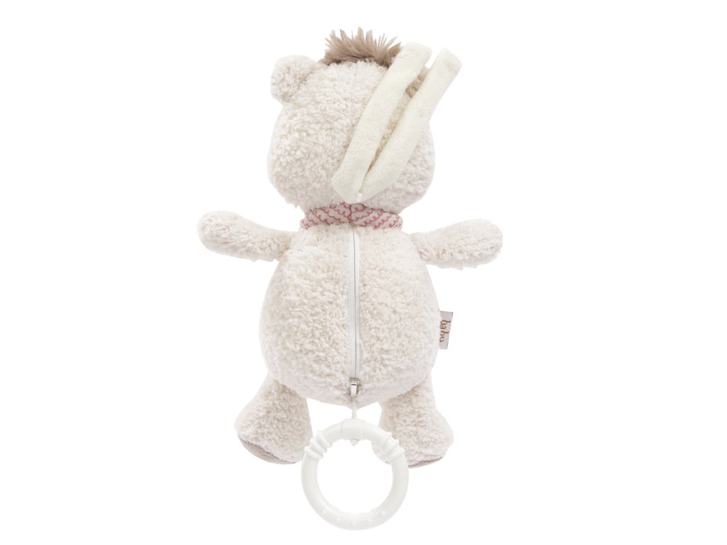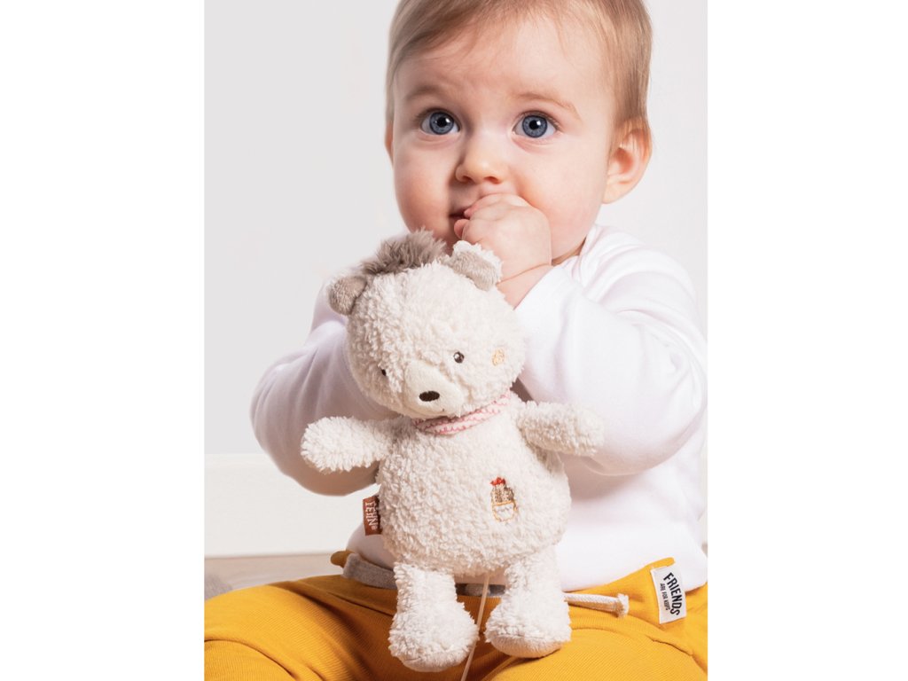 Plyšový medveď s hracím strojčekom, ktorý sa spúšťa zatiahnutím za krúžok. Strojček sa dá vybrať, hračka má zips. Príjemné tlmené farby a mäkký materiál podporujú maznanie a upokojujú dieťa. Vďaka dvom popruhom možno hračku rýchlo pripevniť na kočíky, autosedačky a postieľky.
