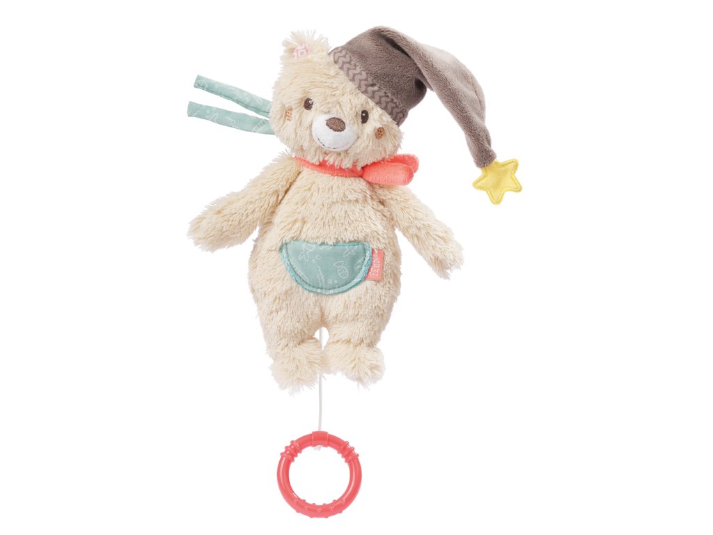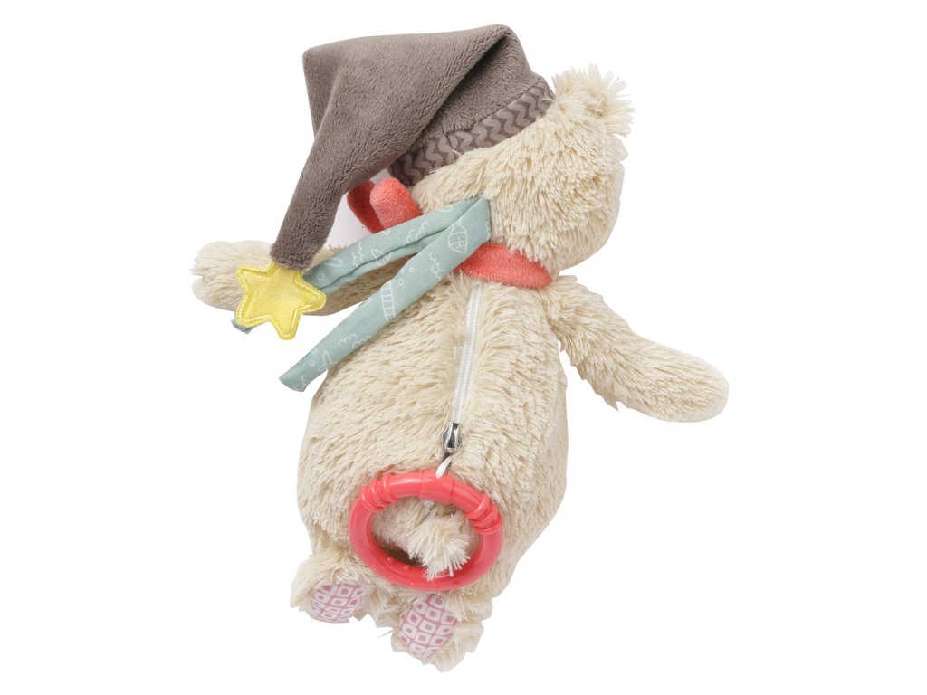 Plyšový medvedík s hracím strojčekom, ktorý sa spúšťa zatiahnutím za krúžok. Strojček možno vybrať, hračka má zips. Príjemné tlmené farby, veselá spacie čiapočka na medvedíkovi, to všetko nabáda k maznanie a dieťa upokojuje. Vďaka dvom pásikom ho rýchlo pripevníte na kočík, detské sedačky a detskú postieľku.