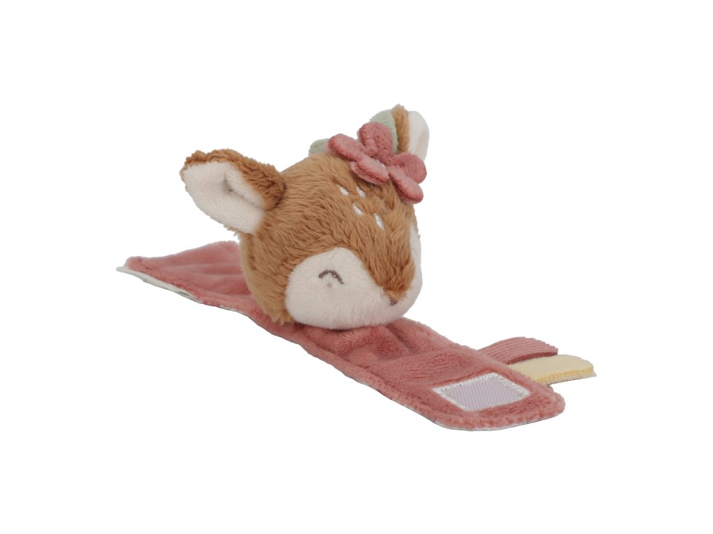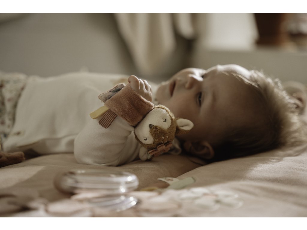 Mäkká hrkálka s rozkošnou srnkou ľahko pripevníte na ruku dieťaťa s pomocou úchytu na suchý zips. Hračka z jemného plyšového materiálu hrká, šuštia a láka dieťa na skúmanie.