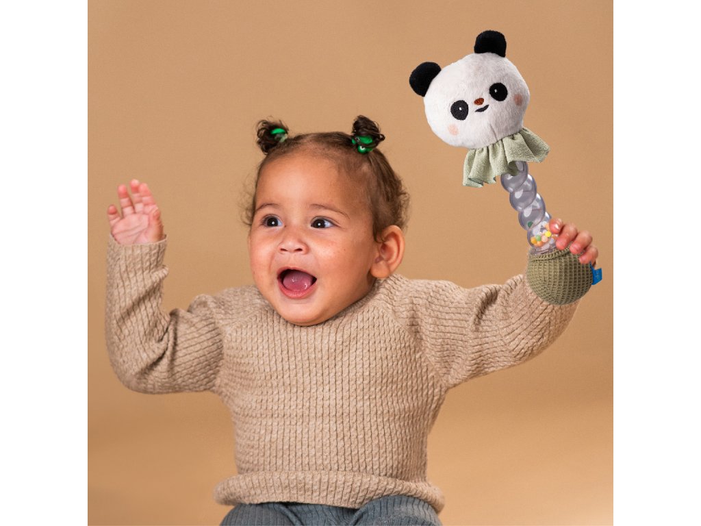 Hrkálku tvorí mäkká plyšová hračka v tvare usmievavej pandy a priehľadné plastové držadlo naplnené farebnými korálkami. Ukľudňujúci zvuk…