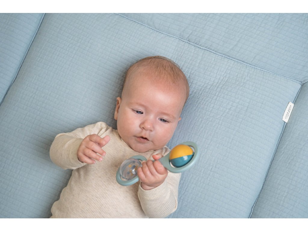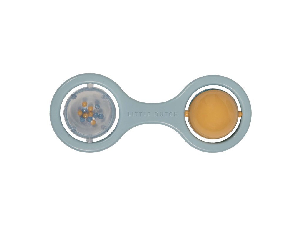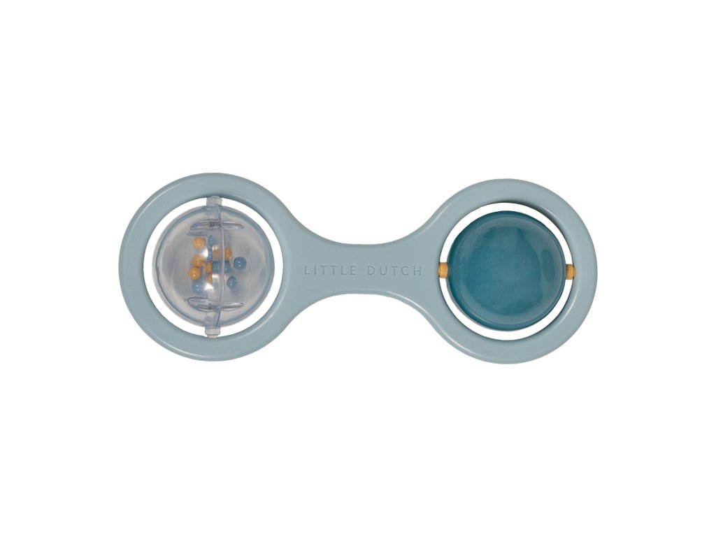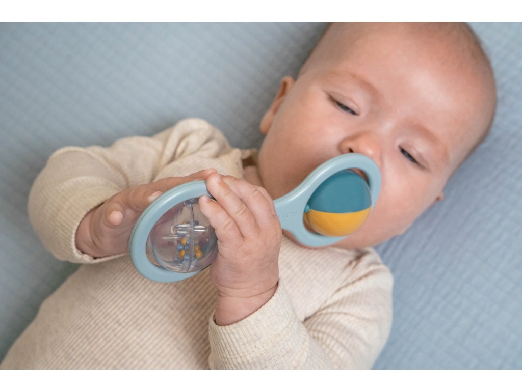 Hrkálka s dvoma otáčajúcimi sa guličkami je ideálna ako prvá hračka pre vaše bábätko. Pozornosť dieťaťa upútajú chrastiace korálky v priehľadnej guličke aj striedajúce sa farby pri otáčaní dvojfarebnej guličky. Hrkálka má tvar pre ľahké uchopenie malými detskými ručičkami.