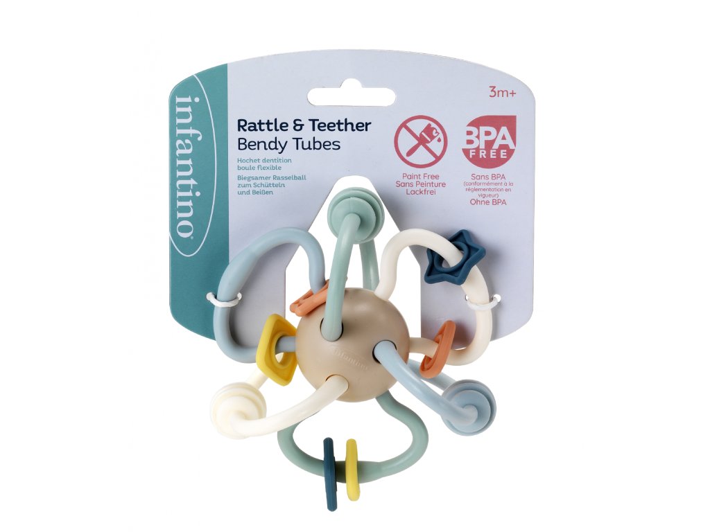 Hrkálka s hryzátkami Infantino láka bábätko na objavovanie tvarov a textúr. Hračka ponúka posuvné korálky a pružné slučky, pri pohybe jemne hrká a funguje aj ako hryzátko, ktoré pomáha pri prerezávaní prvých zúbkov dieťaťa. Tvar hrkálky je navrhnutý pre ľahké uchopenie malými detskými ručičkami.