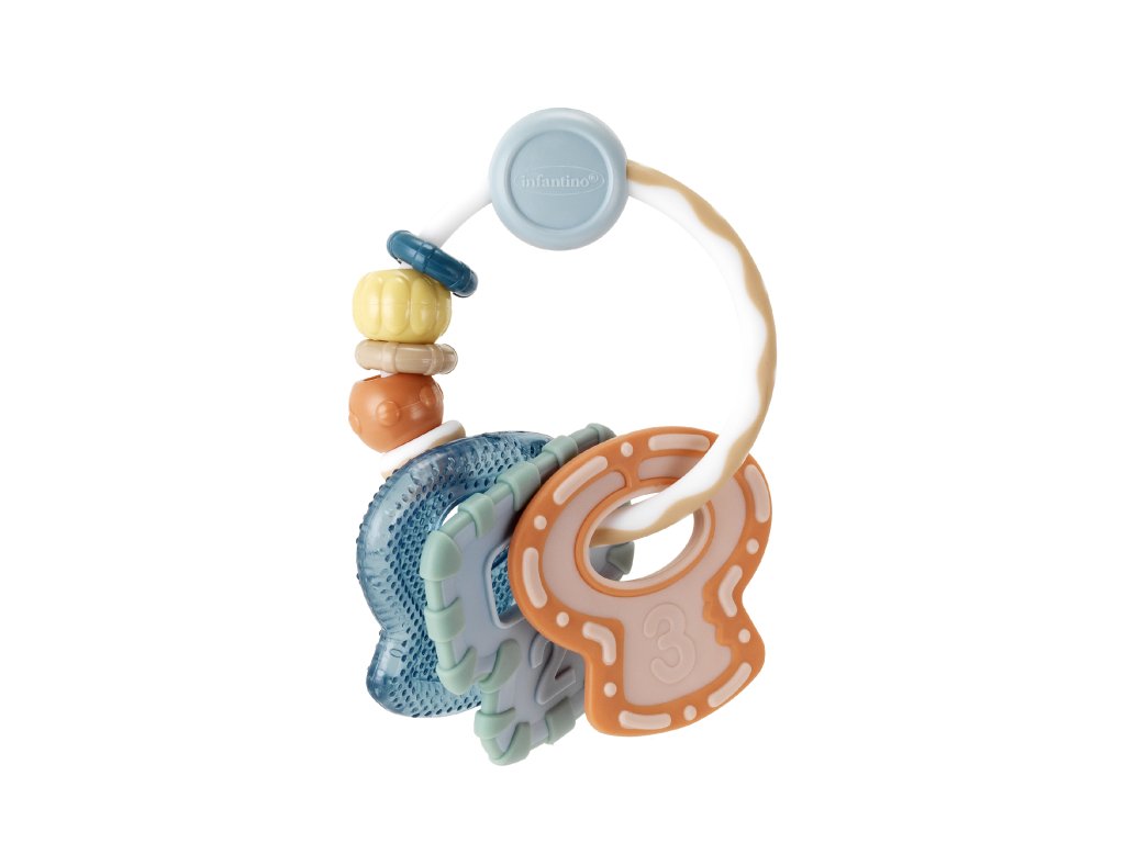 Hrkálka Infantino v podobe krúžku s posuvnými korálkami a kľúčami, ktoré slúžia aj ako hryzátka na úľavu pri prerezávaní prvých zúbkov. Hryzátka majú rôzne povrchy (mäkšie aj pevnejšie) a je možné ich ochladiť v chladničke pre väčšiu úľavu pri raste zúbkov. Hračka pri pohybe jemne hrká.
